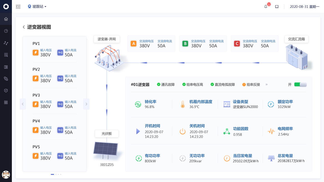 逆變器視圖界面需求變更比較大,圍繞逆變器這一核心部件,增加很多前后環(huán)節(jié)中實時數(shù)據(jù)信息,但展示本質(zhì)并未發(fā)生變化。