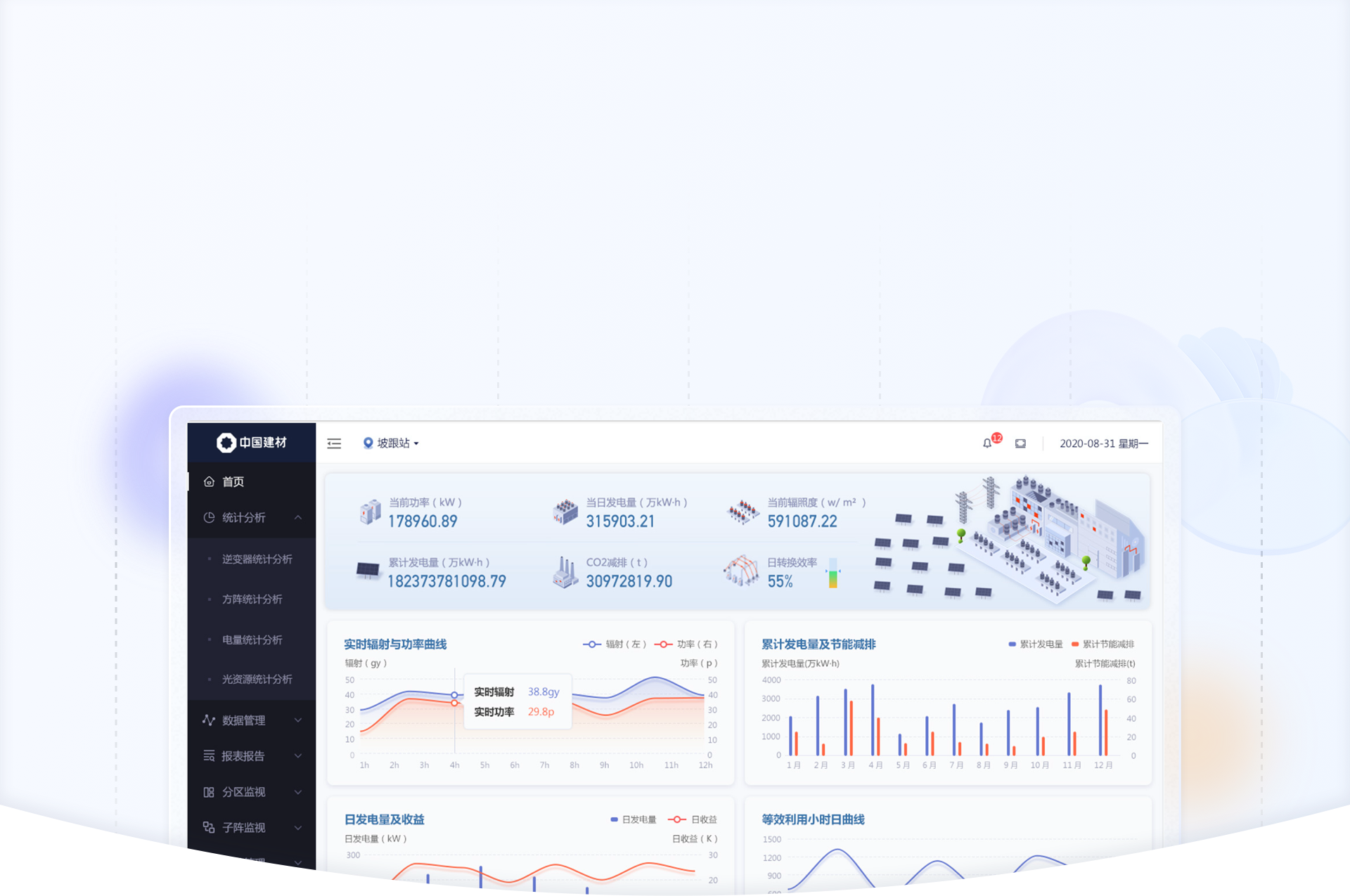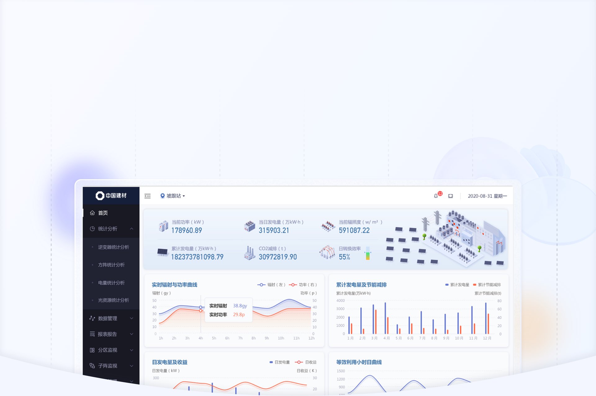 設(shè)計前期,藍藍設(shè)計通過問卷調(diào)查方式確定客戶風格和喜好,并和客戶溝通頁面交互邏輯和優(yōu)化方法,確定交互方式后,再進入視覺設(shè)計階段,這樣可以快速確定設(shè)計方向,節(jié)省大量時間。視覺設(shè)計方面,藍藍設(shè)計嘗試將2.5d圖標融入界面設(shè)計中,通過立體化,場景化的圖標,更加直觀地展示出產(chǎn)品功能屬性和使用場景,為光伏電站UI設(shè)計方向提供藍藍的設(shè)計方案。