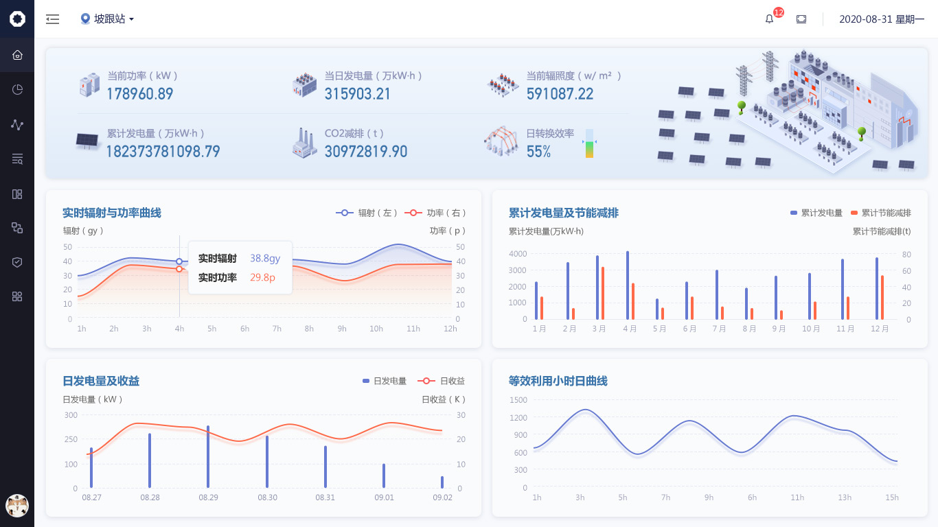 針對數(shù)據(jù)信息發(fā)生的變化,我們使用“場景化設(shè)計原則“,用立體圖標方式繪制出從”光伏板-逆變器-交流匯流箱“發(fā)電原理圖,把數(shù)據(jù)展示在對應(yīng)的環(huán)節(jié)中,形成可視化的實時監(jiān)控圖譜。;其余與發(fā)電流程無關(guān)的數(shù)據(jù)也均以圖標+文字的形式展示頁頁面右側(cè)。