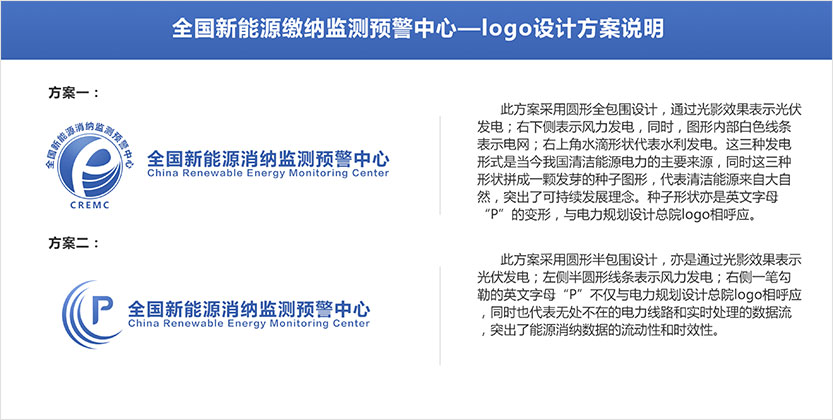 11月5日初次需求調(diào)研提出需求: 1.logo要體現(xiàn)中國(guó)電力規(guī)劃總院元素 2.顏色配比與電力規(guī)劃總院保持一致 3.突出風(fēng)電,光伏發(fā)電元素,電網(wǎng)元素和監(jiān)測(cè)動(dòng)態(tài)性 4.樣式設(shè)計(jì)要簡(jiǎn)潔,沉穩(wěn)大氣,體現(xiàn)專(zhuān)業(yè)性