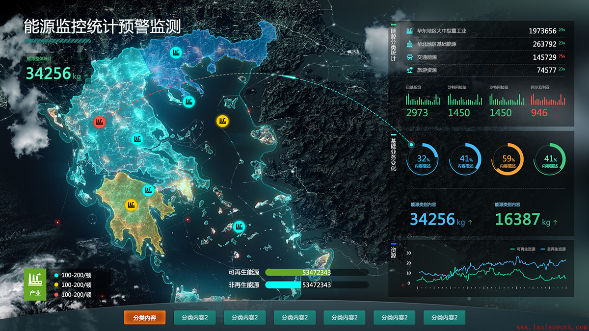 大屏可視化界面設(shè)計(jì)可謂是當(dāng)今行業(yè)、企業(yè)發(fā)展的見(jiàn)證,生動(dòng)直觀地再現(xiàn)了行業(yè)、企業(yè)的全貌。不僅作為展示,方便了解、監(jiān)督;同時(shí)可以作為一個(gè)有效的管理平臺(tái),帶來(lái)效益。大屏界面面向范圍廣,協(xié)同性好,易于被采用。下面幾個(gè)大屏的界面設(shè)計(jì),沉穩(wěn)的背景上,加上亮色作為點(diǎn)綴和強(qiáng)調(diào)。既不失其風(fēng)格,又富有靈動(dòng)性。