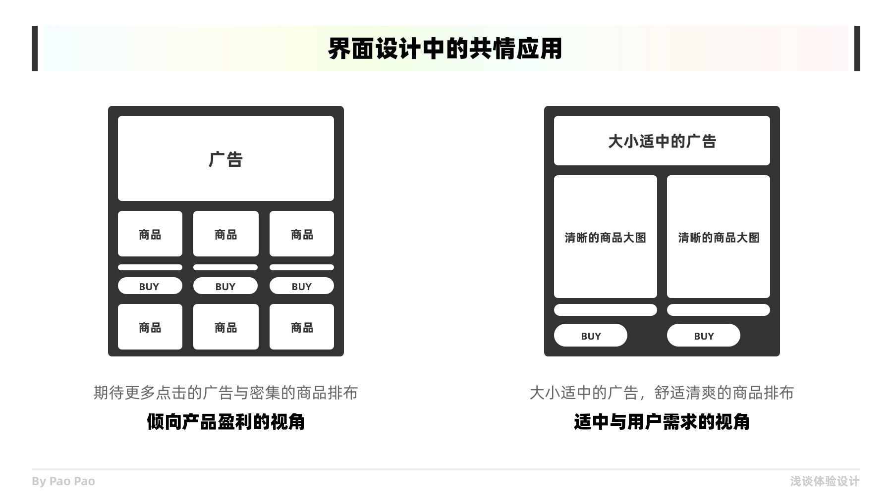 對(duì)于“共情”我更多的理解成是兩個(gè)或多個(gè)載體之間的一種共識(shí)一種情緒共鳴,然后再到行為跟思維上的影響。但實(shí)際上發(fā)生完全的共情是不可能的,有時(shí)連我們自己也會(huì)做一些無法理解的迷惑行為,并且客體是多樣化的,可以是跨物種的,跨維度的。而我們要做的就是在工作中定義共情的有效范圍,盡可能的與目標(biāo)用戶產(chǎn)生共情以了解更多信息或需求,然后去定義和構(gòu)思新的需求與設(shè)計(jì)。共情很重要,但它不是設(shè)計(jì)工作中的全部,有效而不要過度的使用也很重要。