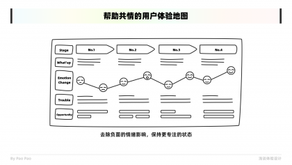 圖表、筆記、錄制設(shè)備是幫助我們共情的最好工具,在不同的場(chǎng)景下,這些工具能夠幫助我們更好的收集信息,并且便于我們思考和共情。我們?cè)诙虝r(shí)間能記住的信息是有限的,這也是為什么我們會(huì)用到7±2這種定律去控制信息量的原因。以用戶體驗(yàn)地圖為例,在記載用戶體驗(yàn)產(chǎn)品的過程中,便是一種很好的共情輔助工具,它能夠按照使用步驟或階段記載用戶使用情況和情緒變化等反饋。