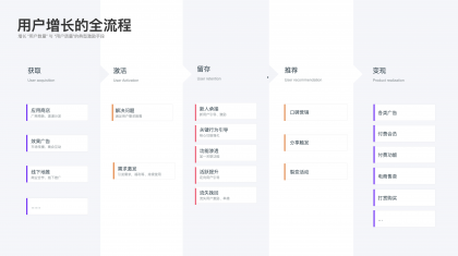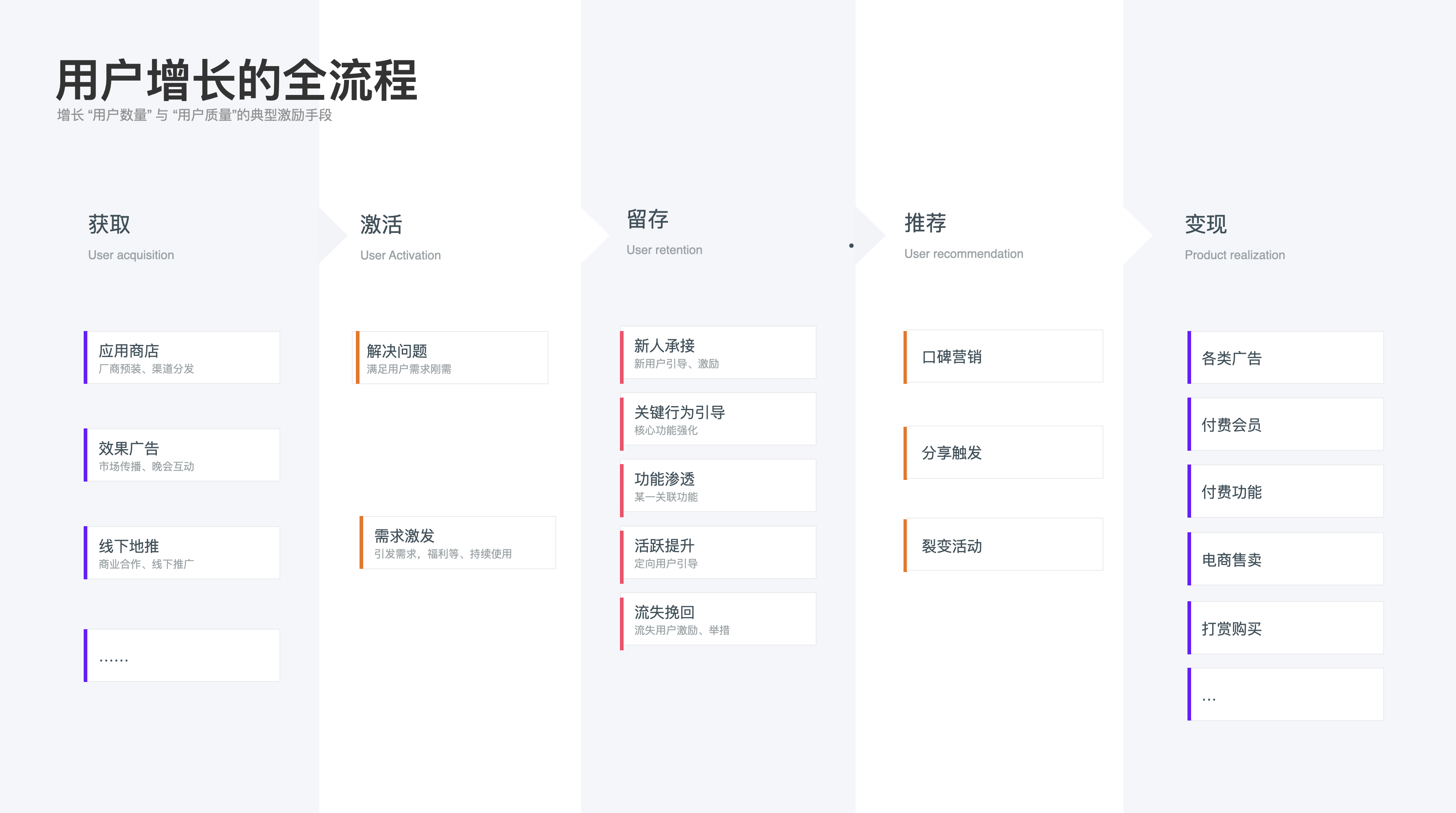 以上是用戶視角下的激勵體系,下面講講產(chǎn)品業(yè)務(wù)下的激勵體系的作用,通常情況下激勵體系伴隨著用戶增長的全流程“獲取—激活—留存—推薦—變現(xiàn)”各個過程。用戶增長代表著增長“用戶數(shù)量”與“用戶質(zhì)量”,以上三類激勵方式都會在產(chǎn)品增長的各流程中承擔(dān)著不同程度的促進作用: