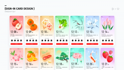 等級中的簽到是最易完成任務(wù)類型,部分老用戶始終堅持簽到,甚至達到百日以上,表明簽到系統(tǒng)確實能促進用戶留存。因此設(shè)計上強化了簽到按鈕與簽到后的反饋,并衍生出了新的簽到反饋——日簽卡。日簽卡以彌散清新的風(fēng)格進行對應(yīng)設(shè)計,配合常用的花卉、食材等圖案、文案分別對應(yīng)中年人愛看的人生感悟、養(yǎng)生常識、歷史上的今天,溫馨感十足,上線后還吸引了大量用戶分享保存日簽卡,極大的提升了簽到用戶的次日留存。