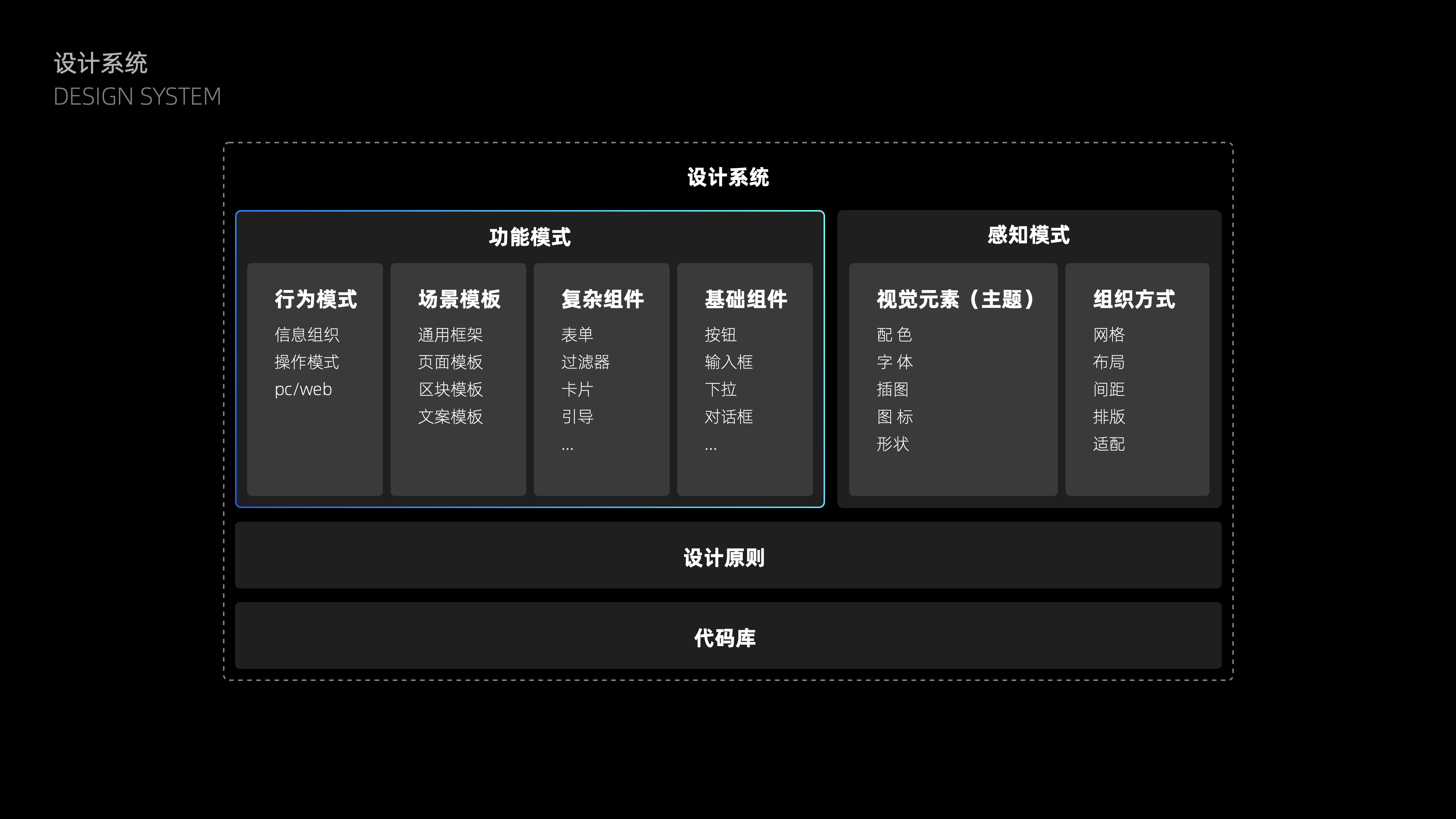 大多數(shù)日常需求大多是從單點(diǎn)出發(fā),當(dāng)點(diǎn)變多變復(fù)雜了,就容易出現(xiàn)上述說到的現(xiàn)狀問題。所以解決方案需要基于業(yè)務(wù)全盤進(jìn)行設(shè)計(jì)抽象:從元素——組件——區(qū)塊——頁面——功能流程沉淀設(shè)計(jì)規(guī)則并代碼化,來靈活提供拼裝N個不同頁面的機(jī)制,幫助團(tuán)隊(duì)更系統(tǒng)化的進(jìn)行產(chǎn)品設(shè)計(jì)。從組成內(nèi)容不難看出,解決方案是需要建立在基礎(chǔ)組件基礎(chǔ)上,與基礎(chǔ)組件、復(fù)雜組件、行為模式共同組成設(shè)計(jì)系統(tǒng)的【功能模式】部分。