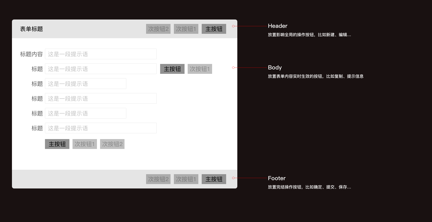 表單中比較常見的按鈕大概有“保存”、“提交”、“取消”、“關(guān)閉”、“暫存”、“下一步”、“上一步”...由于B端產(chǎn)品業(yè)務(wù)邏輯較復(fù)雜通常頁(yè)面中會(huì)有很多操作按鈕,為了更快捷準(zhǔn)確的操作,就需要對(duì)按鈕按照重要程度分為主按鈕,次級(jí)按鈕;為了達(dá)到這樣的目的僅僅依靠按鈕樣式還遠(yuǎn)遠(yuǎn)不夠,還得根據(jù)視覺動(dòng)線給出合理的排列順序。關(guān)于按鈕順序,最常見的疑問是主按鈕應(yīng)該在次級(jí)按鈕左邊還是右邊,這里建議使用基于Ant Design 的設(shè)計(jì)原則,將規(guī)范定為:左對(duì)齊從左往右閱讀,右對(duì)齊從右往左閱讀;