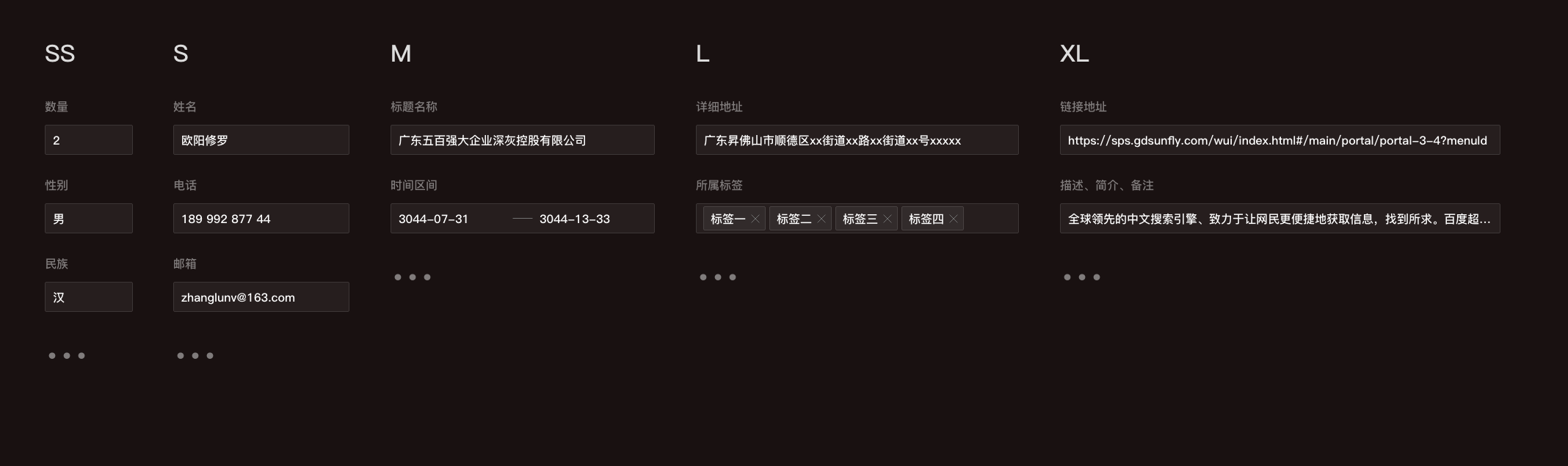 超短(XS):用于短數(shù)字、超短文本 短(S):適用于較短文本輸入,如個(gè)人信息(姓名、電話、郵箱等) 標(biāo)準(zhǔn)(M):默認(rèn)輸入框長(zhǎng)度,適用大多數(shù)情況 長(zhǎng)(L):適用較長(zhǎng)文本輸入,如網(wǎng)頁(yè)地址、標(biāo)簽組等 超長(zhǎng)(XL):適用超長(zhǎng)文本輸入如正文(描述信息、備注、摘要、介紹、備注)、超長(zhǎng)鏈接等選擇合適的輸入框?qū)挾瓤梢詫?duì)使用者產(chǎn)生一定的心理暗示從而來減輕使用者的心理負(fù)擔(dān),因?yàn)樵诳吹阶侄螛?biāo)題時(shí),心理都會(huì)產(chǎn)生對(duì)所填信息的預(yù)期,大概我要填寫什么,如果選用的輸入框?qū)挾炔缓线m一方面會(huì)對(duì)使用者造成一定的填寫負(fù)擔(dān),同時(shí)還會(huì)對(duì)用戶產(chǎn)生一定程度的誤導(dǎo)。比如:填寫戶籍所在地時(shí),如果輸入框給的太寬就會(huì)疑惑,到底應(yīng)該寫“xx省xx市”、還是應(yīng)該填到具體“省-市-區(qū)-街道-xx號(hào)”呢?當(dāng)遇到更復(fù)雜的場(chǎng)景和混排輸入框的情況,為了讓頁(yè)面呈現(xiàn)的內(nèi)容更加有序、整齊,可參照山歌系統(tǒng)的定義方式來定義5種梯度寬度,從而方便設(shè)計(jì)執(zhí)行和技術(shù)開發(fā)。比如定義為 A=超短(XS)的寬度;短(S)的寬度=2A+n;以此類推