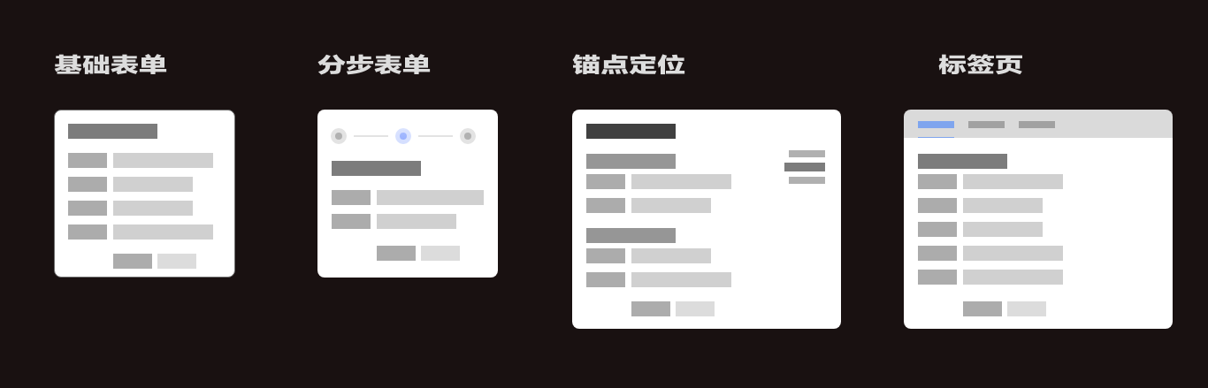 表單在設(shè)計(jì)時(shí)需要對(duì)其進(jìn)行合理的歸納簡(jiǎn)化,降低表單填寫負(fù)荷。 通常我們將表單分為基礎(chǔ)表單、分步表單、錨點(diǎn)定位、標(biāo)簽頁(yè)這幾類。