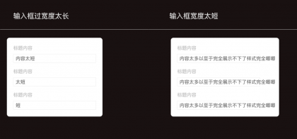 采用這樣的處理方式時(shí),需要控制表單內(nèi)輸入內(nèi)容的長(zhǎng)度高度一致,不然會(huì)面臨以下兩種尷尬:面對(duì)尷尬一(長(zhǎng)度定太短)內(nèi)容擴(kuò)展性太差,無(wú)法同時(shí)滿足大段信息展示。面對(duì)尷尬一(長(zhǎng)度定太長(zhǎng))輸入框當(dāng)只填寫一兩個(gè)字符時(shí),會(huì)很空視覺效果不佳。