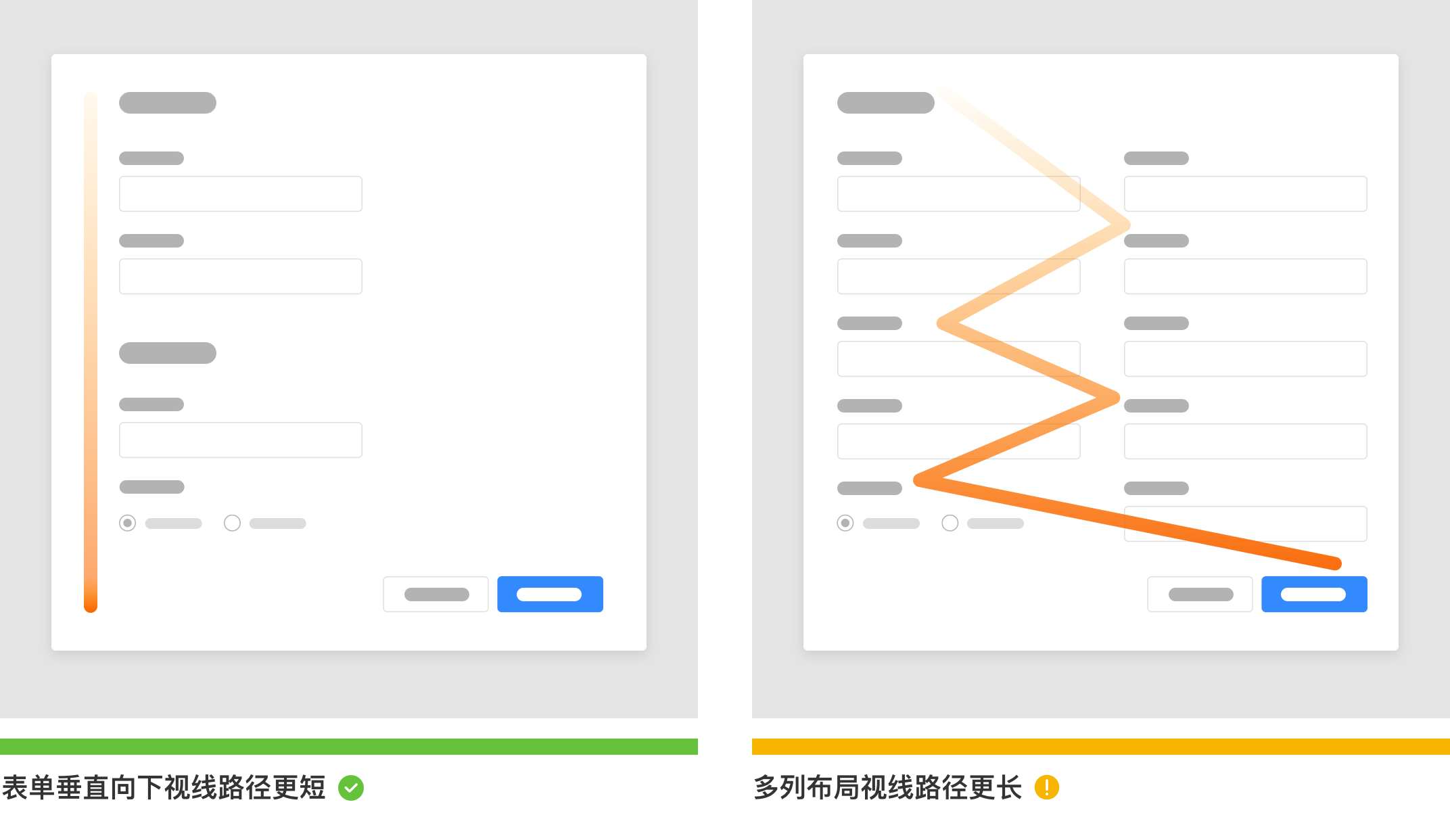 如果表單使用單列,則完成的路徑是頁面垂直向下的一條直線,單列布局能夠給用戶呈現(xiàn)一條清晰的視覺路。因此,表單較為簡單時盡量避免將表單分成多列,在業(yè)務(wù)場景允許的情況盡量使用單列(部分業(yè)務(wù)訴求和一些特定場景要求,多列布局會更節(jié)省垂直空間,但是多列布局需要考慮字段之間的關(guān)聯(lián)性,這里不強(qiáng)求一定只能使用單列布局)。