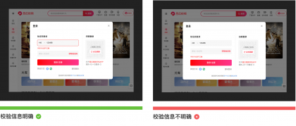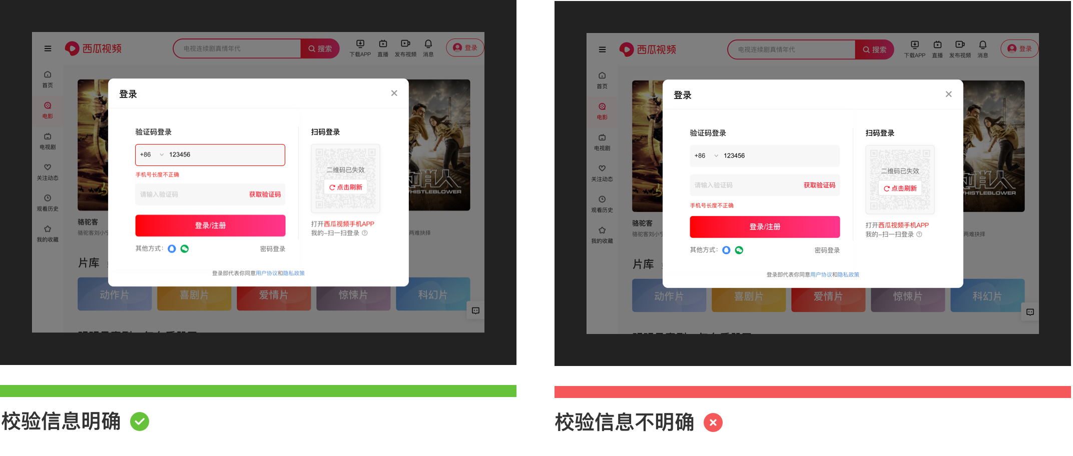 錯誤校驗提示一般存在于錯誤率較高情況下出現(xiàn),如:在登錄注冊時,要求用戶填寫手機(jī)號,如果用戶輸入的手機(jī)號碼不符合特定的輸入格式,那么這時候需要明確標(biāo)記錯誤原因,準(zhǔn)確的幫助用戶找到問題并解決,避免錯誤提示描述模糊不清誤導(dǎo)用戶。錯誤提示一般會采用“雙重視覺強(qiáng)調(diào)”來顯示錯誤,除了輸入框突出顯示外,同時需要在輸入框下方加入紅色指導(dǎo)文字。如下圖所示為西瓜視頻登錄注冊場景下的截圖:
