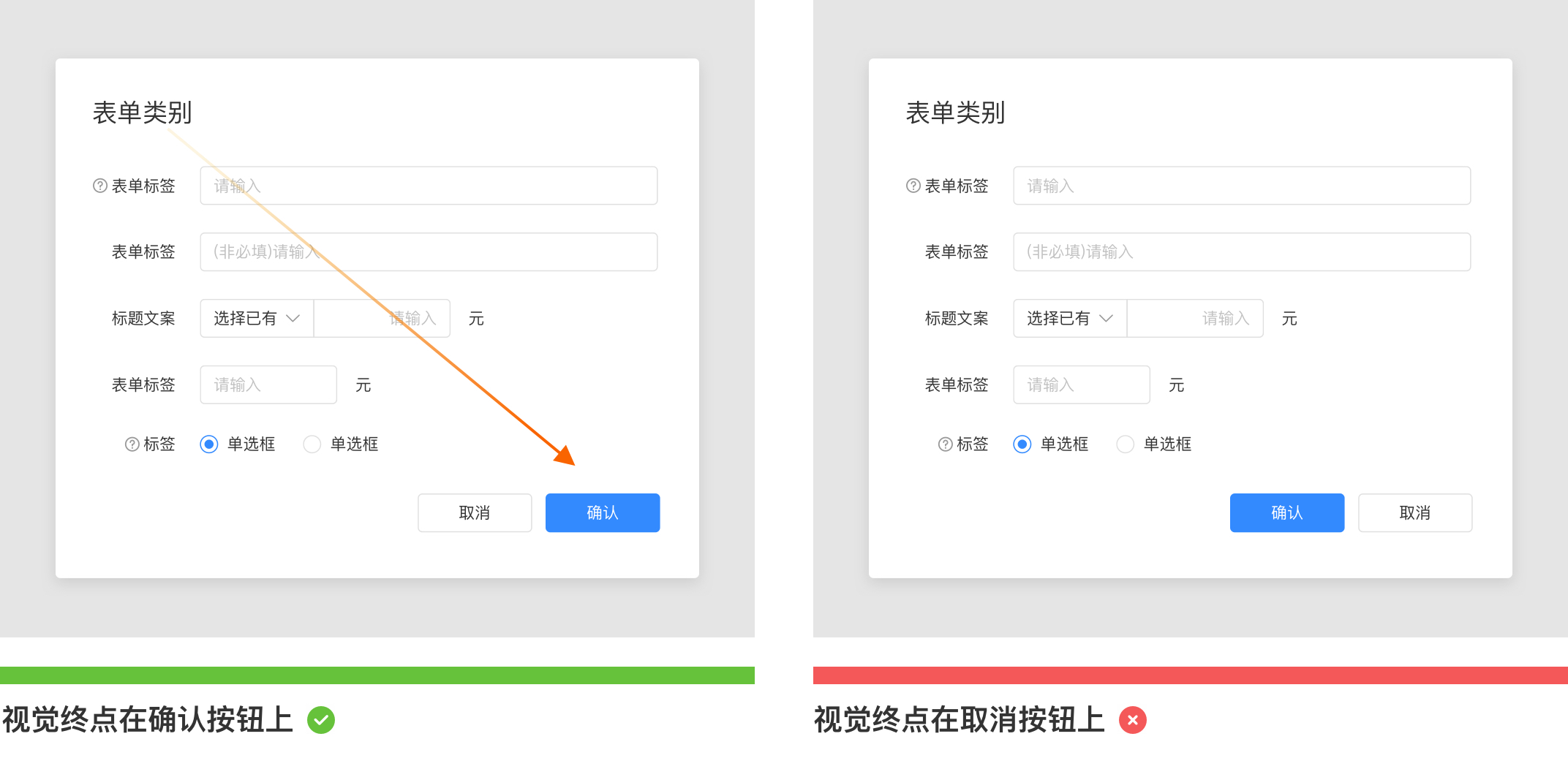 如下圖是一個彈窗類型的表單,如果根據(jù)業(yè)務(wù)訴求確認(rèn)操作重要程度強(qiáng)于取消操作,那么確認(rèn)按鈕應(yīng)該放在取消按鈕的右邊。因為確認(rèn)按鈕放在右側(cè)(終點區(qū)) 用戶關(guān)注度會更強(qiáng)。