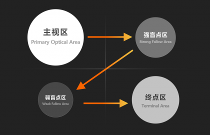 所以,界面中的左上和右下是用戶視覺最為重點關(guān)注的位置。遵循古騰堡法則,設(shè)計師應(yīng)該把界面的關(guān)鍵元素放在主視區(qū),終點區(qū)可以放按鈕、強(qiáng)提示,盲點區(qū)可以用來放一些相對次要的內(nèi)容,如輔助圖形、文字信息。