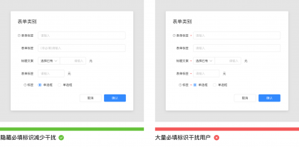 當(dāng)表單中的必填信息多于非必填信息時,如果使用紅色星號表示必填項,那么大量紅色星號導(dǎo)致增加用戶的認(rèn)知負(fù)擔(dān),使得用戶無法快速識別哪些是必須填寫的,哪些是不必須填寫。并且使用紅色星號會帶給用戶一些恐懼感,它增加了出錯的風(fēng)險并降低了表單填寫率。因此在表單設(shè)計中,當(dāng)必填項多于非必填項時,隱藏紅色星號標(biāo)記,通過暗提示標(biāo)記可選項的形式來幫助用戶識別。