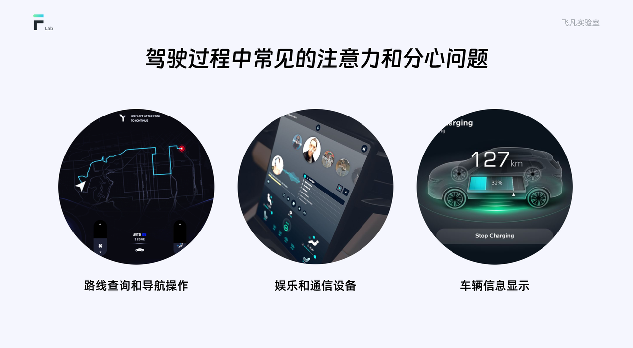 在駕駛過程中,有一些常見的注意力和分心問題需要我們關(guān)注和解決。路線查詢和導(dǎo)航操作:駕駛員需要查看導(dǎo)航系統(tǒng)、調(diào)整路線和尋找目的地等操作,這可能轉(zhuǎn)移駕駛員的注意力,導(dǎo)致駕駛員對道路情況的關(guān)注度下降。娛樂和通信設(shè)備:駕駛員使用娛樂系統(tǒng)或通信設(shè)備進行音樂播放、電話通話或信息發(fā)送等操作,這會分散駕駛員的注意力,增加駕駛風險。車輛信息顯示:車輛上的信息顯示系統(tǒng)可能包含大量的信息,如車速、油耗、車輛故障等,駕駛員需要分散注意力去獲取和理解這些信息,這可能影響駕駛員對道路情況的感知和對緊急情況的反應(yīng)能力。了解駕駛員的注意力和分心因素對于優(yōu)化車載界面設(shè)計至關(guān)重要。那么我們?nèi)绾螏椭{駛員保持集中注意力,并減少分心情況的發(fā)生。