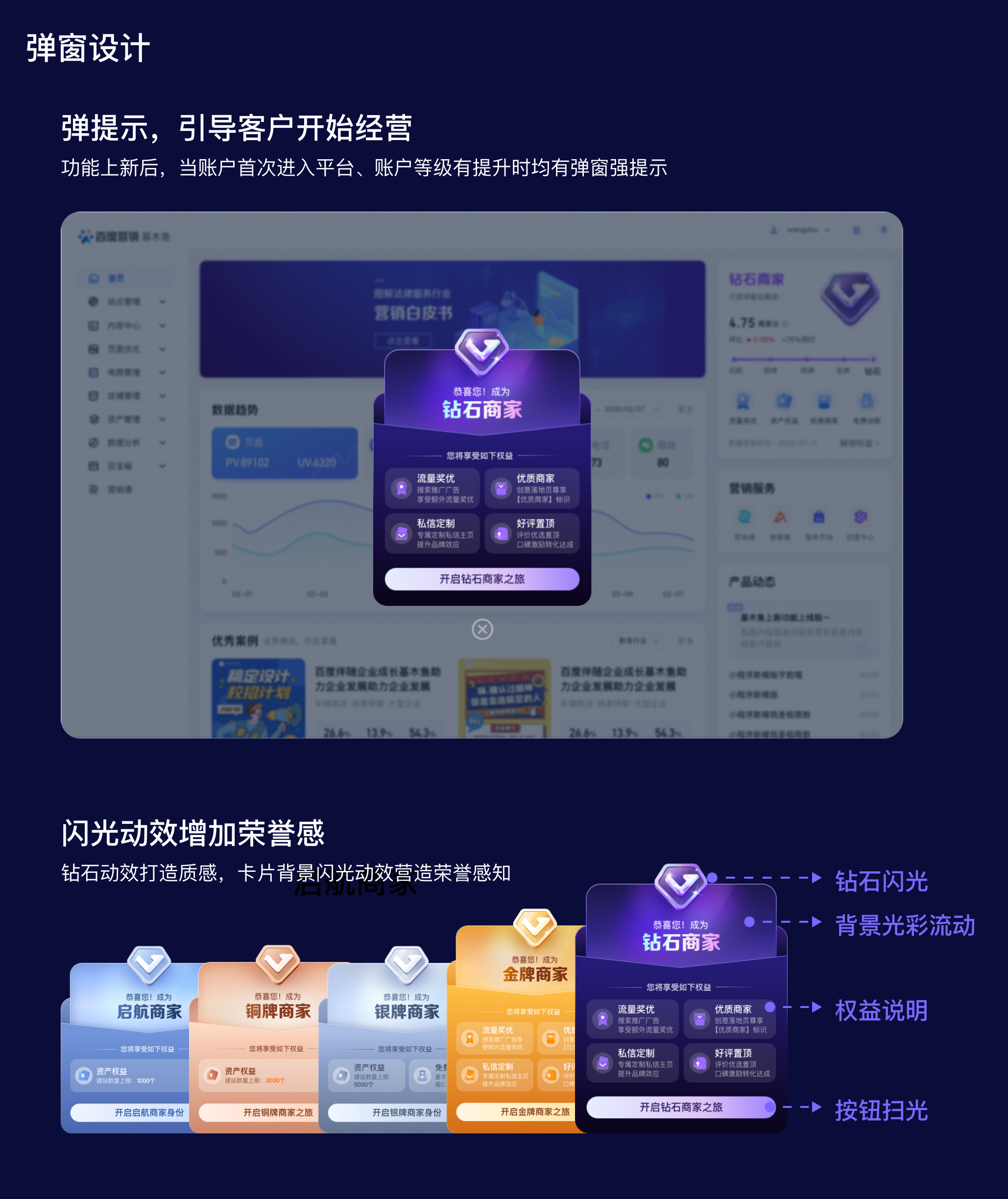 彈窗:作為常見的通知容器,常用于向用戶提供重要的通知、更新、提醒或行動建議。在此項目中,為了增強商家的感知,我們選擇2個場景以彈窗的形式給予商家強提示,一是在功能上線后以彈窗的形式顯示對應(yīng)等級的信息,以吸引商家的注意力并傳達商家等級的關(guān)鍵信息,可以增加商家的感知并引導(dǎo)他們進入商家等級開始經(jīng)營;二是當商家的等級提升時使用彈窗通知,激勵商家持續(xù)經(jīng)營。