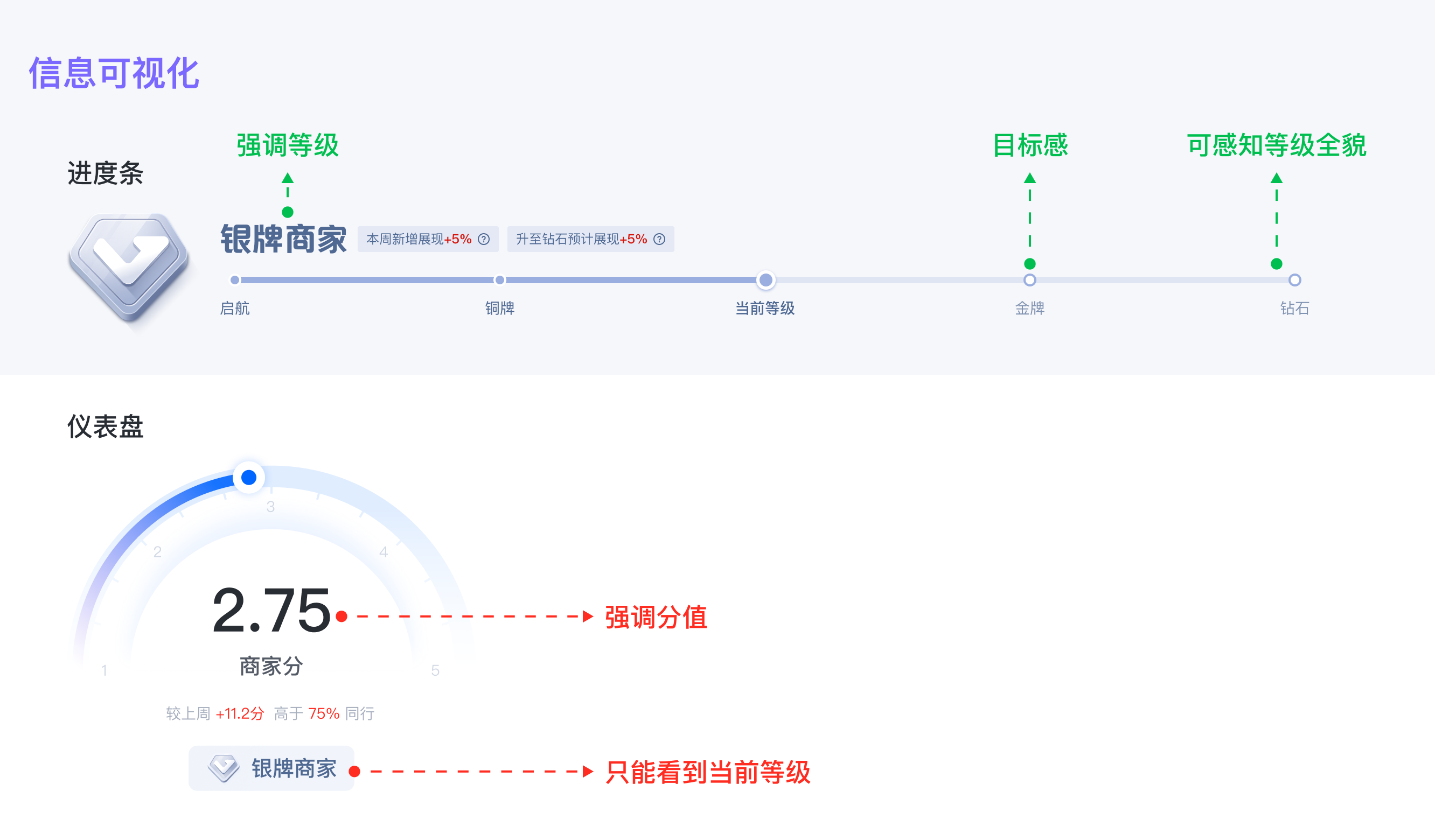 當復(fù)雜的信息難以被商家理解時,可視化作為有效手段,旨在把數(shù)據(jù)資料以視覺化的方式表現(xiàn)出,有效地向受眾傳播信息。可視化首先要根據(jù)信息結(jié)構(gòu)進行圖表選型,在商家等級項目中,我選擇了兩種數(shù)據(jù)圖表(進度條VS儀表盤)來進行商家等級的可視化表達,當兩種圖表放到一起時,可以很明顯的發(fā)現(xiàn)兩者之間的差異,基于這個項目想要強調(diào)的等級概念,最終選擇進度條展示商家等級的成長進度,并激勵其追求下一個等級的提升。這樣,商家能夠準確感知成長進度,衡量自己在商家等級體系里所處的分位以獲取更多成長動力。