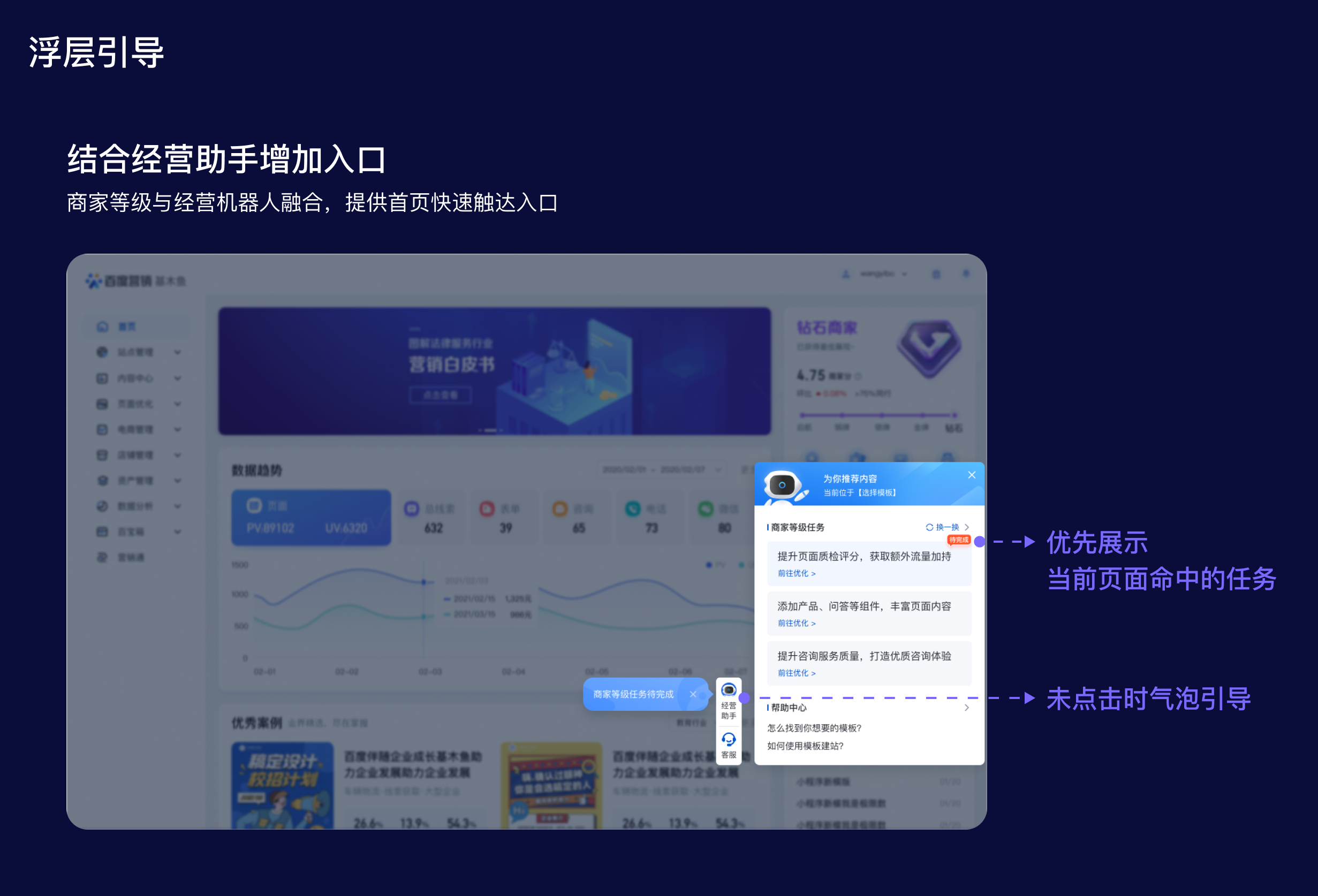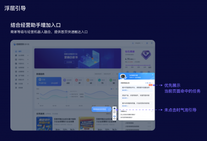浮層:將操作入口前置披露,提升商家感知同時還可以縮短操作步長。在商家等級項目里,衡量商家主動經(jīng)營的標準是做任務(wù),所以任務(wù)入口的前置披露是提升主動經(jīng)營的關(guān)鍵舉措。于是,圍繞商家等級包裝了“經(jīng)營助手”的概念,幫助平臺給商家推薦一些成長任務(wù)和優(yōu)化建議,并在平臺首頁主動彈出,以此提高任務(wù)觸達率。但使用這種主動觸達手段時,需要考慮對商家的打擾和阻斷情況,所以需要對主動彈出的頻率作限制,然后配合氣泡和標簽等視效元素吸引商家視線。這樣可以引導(dǎo)商家參與商家等級完成任務(wù),促進其成長和等級提升。