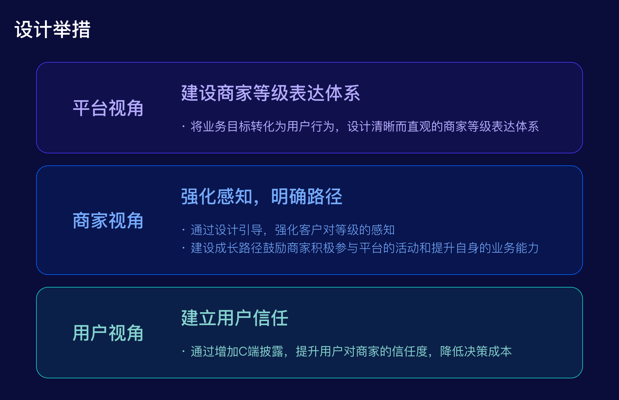 綜合以上分析,設(shè)計舉措應(yīng)注重建立商家等級表達、強化商家的感知和增強用戶的信任。希望通過設(shè)計目標的實現(xiàn),為商家分層模型帶來更好的用戶體驗和商業(yè)效益,提升商家的參與度和忠誠度,促進商業(yè)生態(tài)飛輪的正向運轉(zhuǎn)。