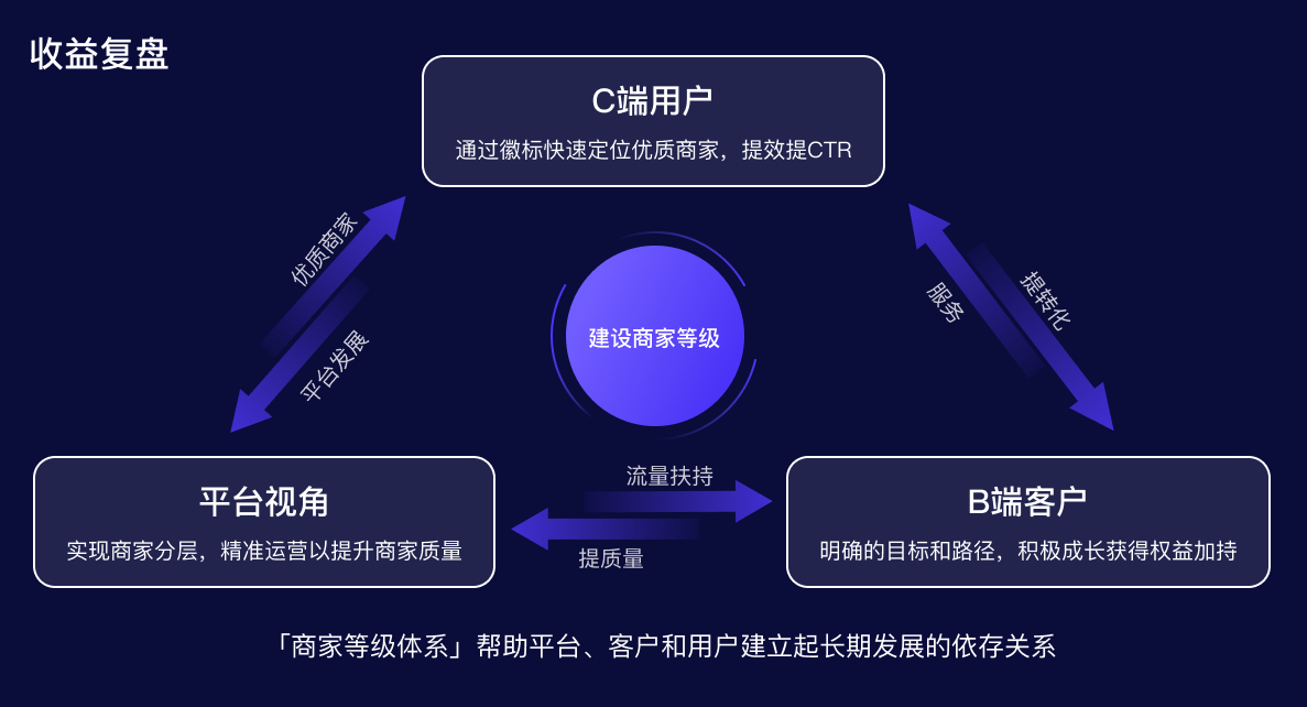 通過以上實施方案,設(shè)計師從不同視角切入,通過權(quán)益激勵吸引商家參與,通過明確用戶成長路徑促進等級提升和商家質(zhì)量的提升,為用戶提供更好的服務(wù),實現(xiàn)平臺生態(tài)的正向發(fā)展。