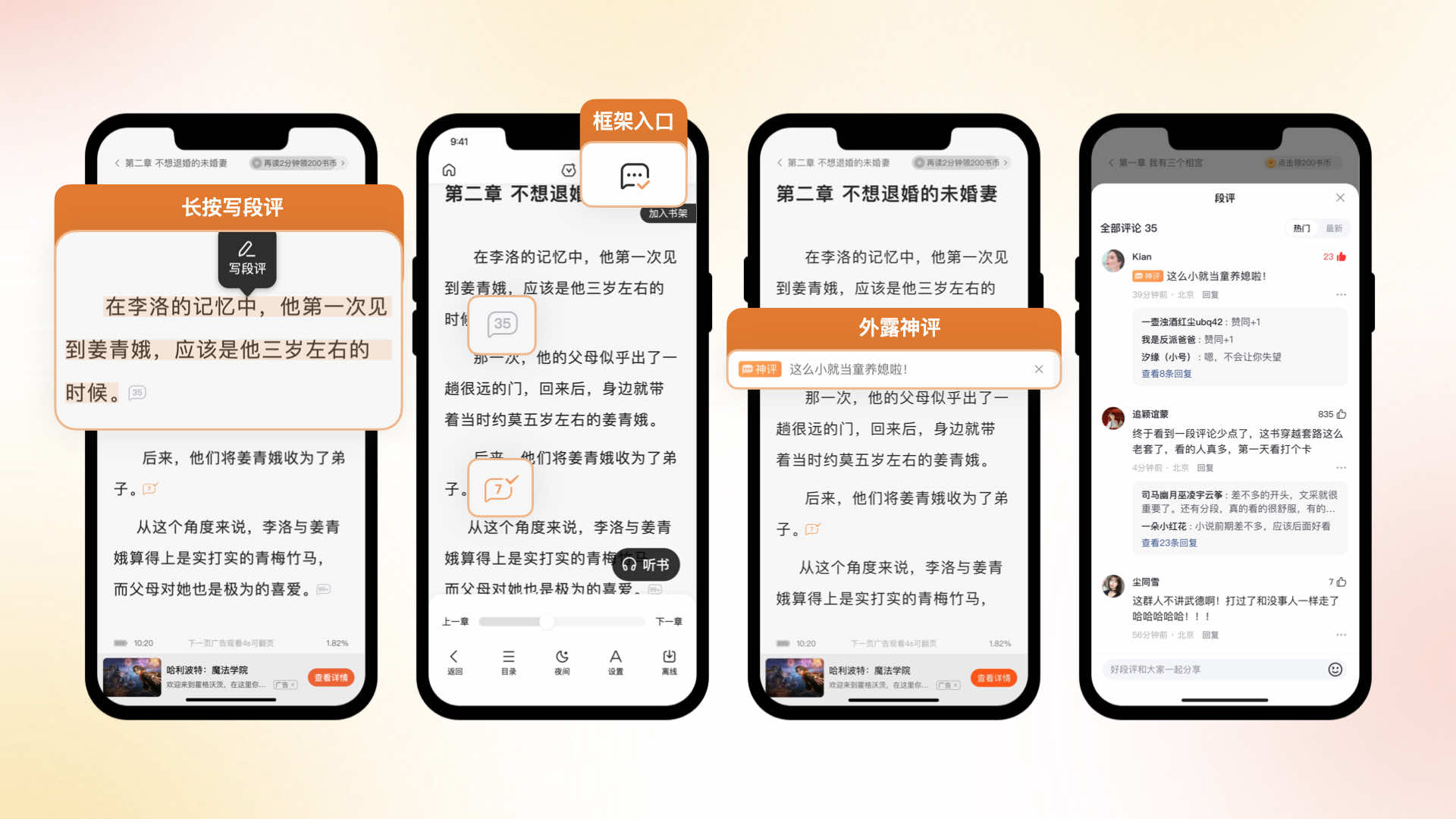 閱讀器場(chǎng)景是用戶使用時(shí)長(zhǎng)最長(zhǎng)的一個(gè)場(chǎng)景。因此我們?yōu)橛脩籼峁┝硕卧u(píng)功能,方便用戶閱讀過程中和書友進(jìn)行交流,為了不影響閱讀的流暢性,我們采用弱化的段評(píng)圖標(biāo)樣式和色彩,段評(píng)入口設(shè)計(jì)在段落尾部,減少對(duì)閱讀的干擾。