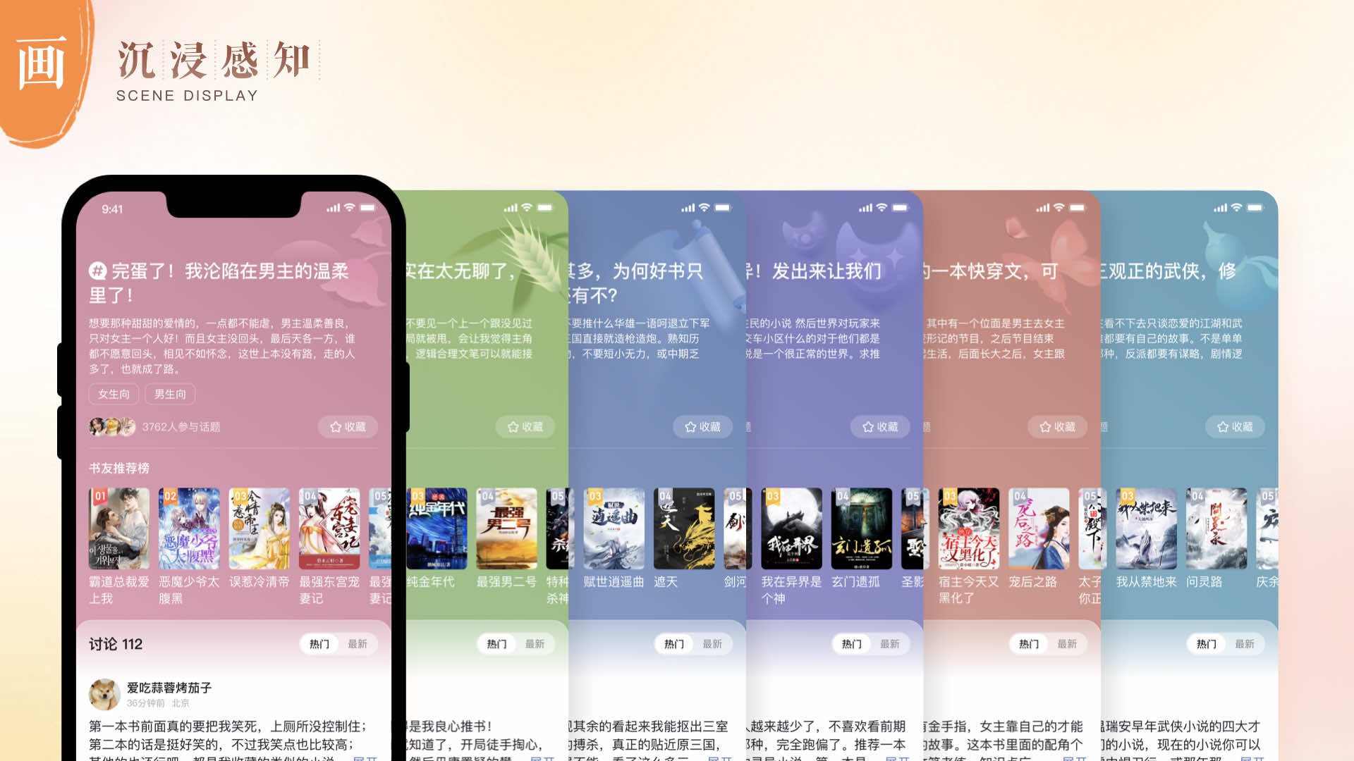 人文感設(shè)計(jì)語言融合了簡(jiǎn)約、舒適、自在的設(shè)計(jì)體驗(yàn),讓人能夠輕松沉浸其中,并感受到獨(dú)特的國(guó)風(fēng)韻味和情感內(nèi)涵。小說設(shè)計(jì)團(tuán)隊(duì)從“色、字、構(gòu)、畫”四個(gè)維度進(jìn)行拆解。