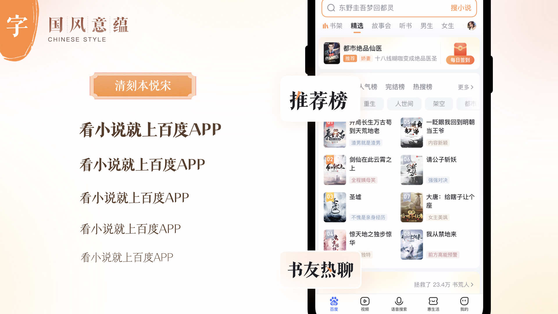基于國(guó)風(fēng)意韻感,設(shè)計(jì)團(tuán)隊(duì)在文字的使用上,也選擇了一套襯線體字體,該字體字形瘦長(zhǎng),柔美清透且識(shí)別度高。在界面中,主要在標(biāo)題區(qū)應(yīng)用這套字體,將其中的一筆進(jìn)行跳色點(diǎn)綴,不僅讓用戶閱讀舒適,而且提升百度小說的品牌識(shí)別度。