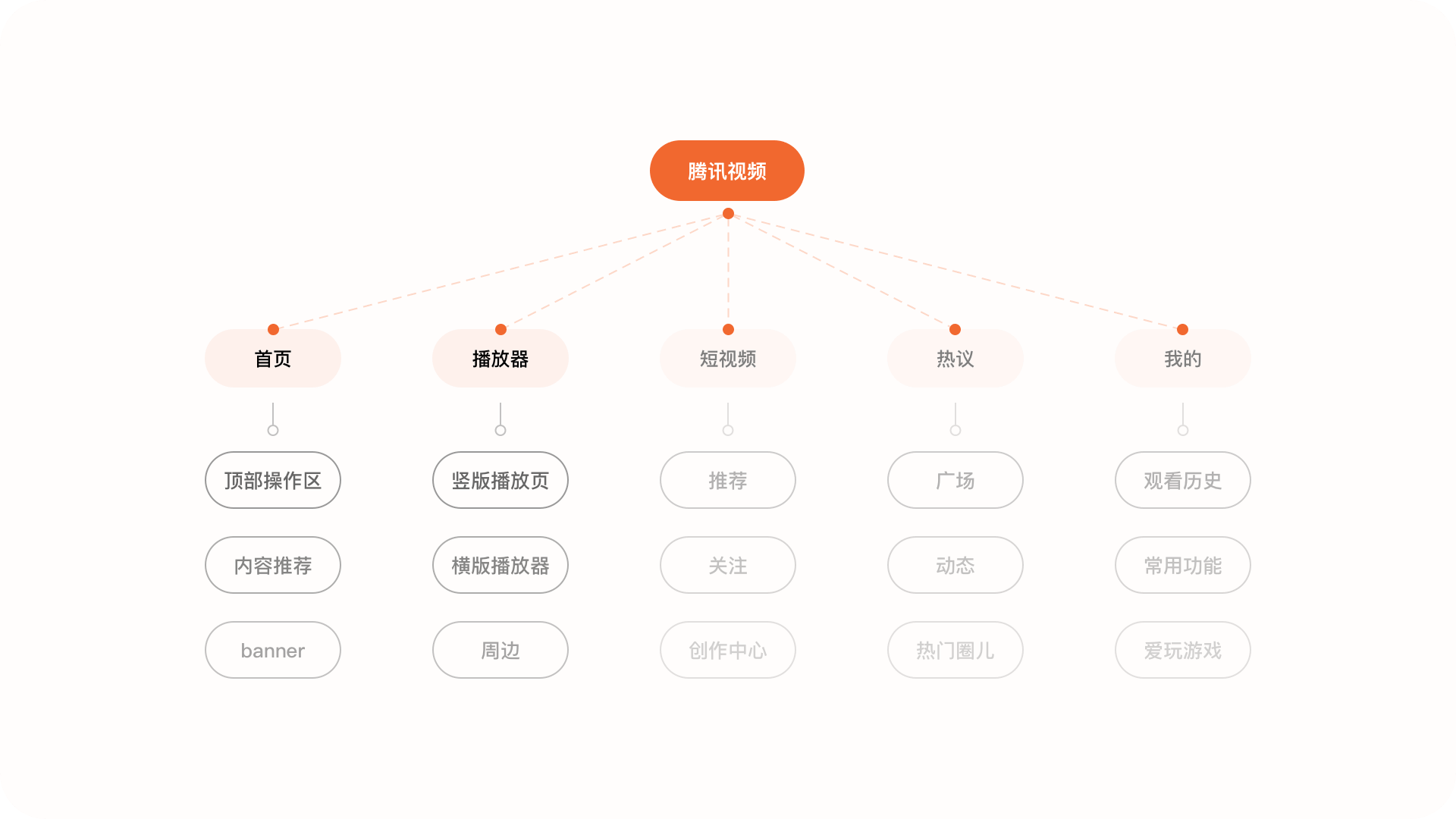 1.內(nèi)容結(jié)構(gòu)作為視頻內(nèi)容平臺,通過對騰訊視頻APP的結(jié)構(gòu)梳理,發(fā)現(xiàn)產(chǎn)品內(nèi)大部分的內(nèi)容都是圍繞視頻來進行拓展,整體框架分為:首頁、短視頻、VIP會員、熱議、我的這幾個模塊。本次我們主要針對于首頁與播放器這兩個場景進行重點分析