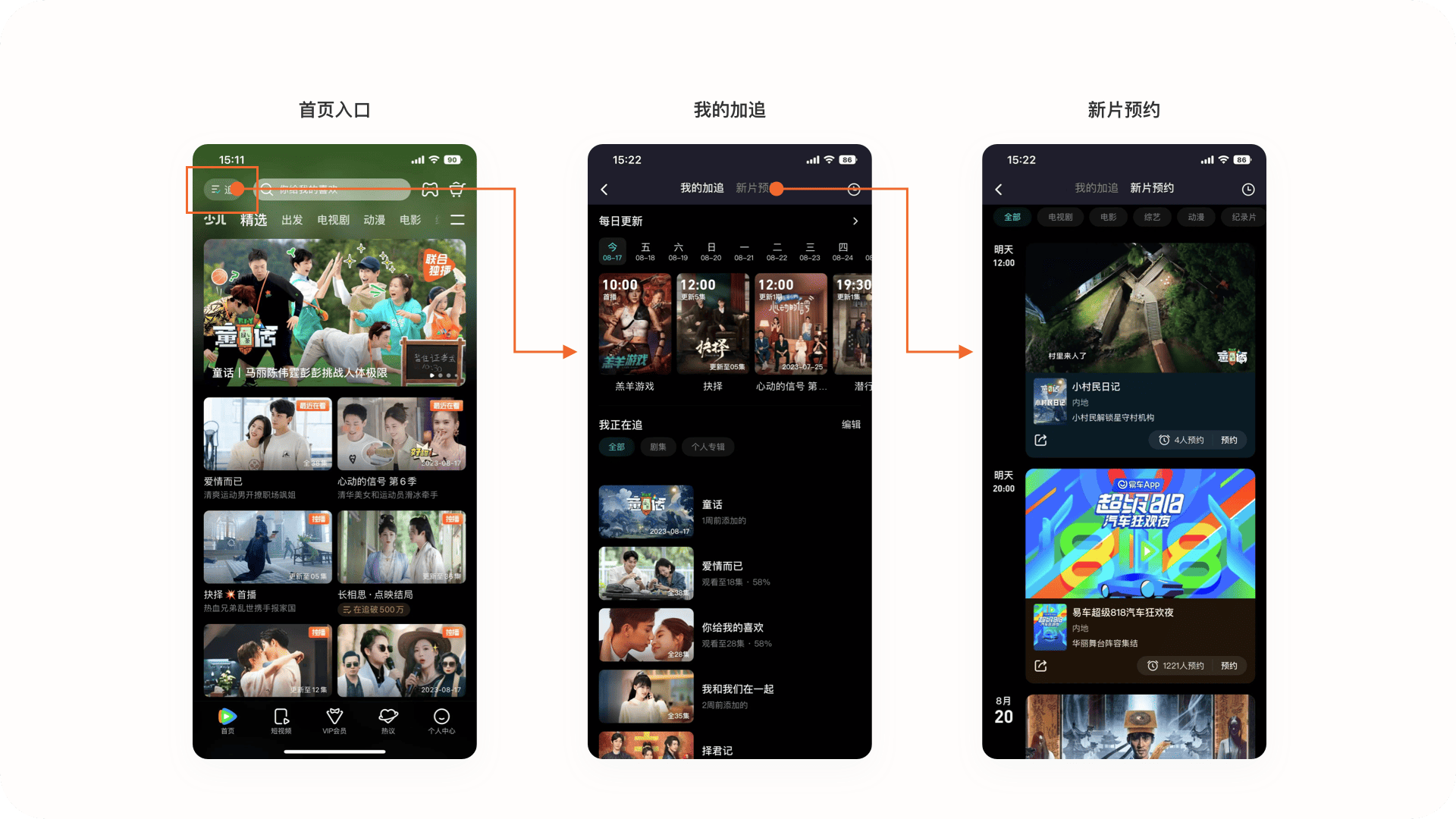 2.1.1產(chǎn)品亮點:加追與預(yù)約功能在首頁左上角增加最近再追功能,此功能讓用戶在首頁就可以更快速的找到自己在追的內(nèi)容,而且在頁面中還包含新片預(yù)約和歷史瀏覽記錄功能,讓用戶在了解更多預(yù)約內(nèi)容與歷史記錄。此功能放在首頁很好的降低用戶操作成本,提升產(chǎn)品體驗。
