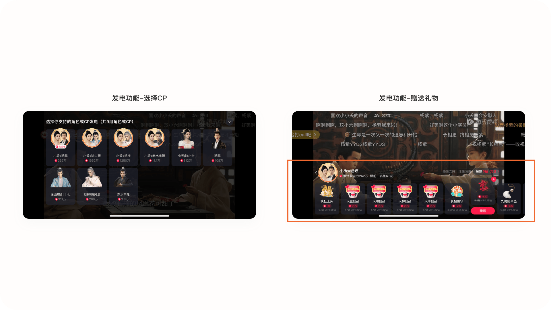 3.2.2產(chǎn)品亮點:發(fā)電功能為自己支持的CP上分在底部操作區(qū)增加發(fā)電功能,用戶可以點擊為自己支持的cp送出禮物,不僅可以滿足用戶的“嗑CP”心理,同時對直播場景中的核心送禮功能很好的結(jié)合到視頻產(chǎn)品中,給視頻內(nèi)容提供了商業(yè)價值,提高產(chǎn)品收入。