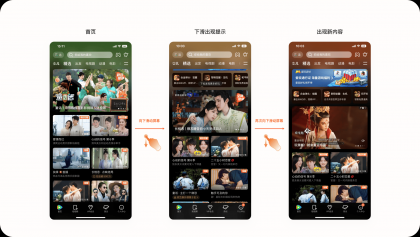2.1.5設(shè)計亮點:下拉刷新新玩法大多數(shù)產(chǎn)品下拉都為刷新界面操作,但騰訊視頻對下拉進行兩部交互操作,用戶下拉到第一個階段會出現(xiàn)提示"下拉發(fā)現(xiàn)更多好玩"當(dāng)前這時用戶松手可以進行常規(guī)刷新操作, 但用戶看到這樣的提示會更想知道在向下拉到會帶來怎么的內(nèi)容,當(dāng)用戶再次下拉后會出現(xiàn)對應(yīng)的內(nèi)容推薦,類似于游戲推廣與熱播劇推廣,賦予用戶驚喜感的同時還能增加廣告收入。