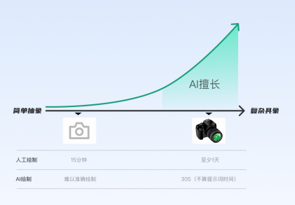 不考慮思考過程時間消耗,將人工手繪和AI繪制對比,AI可能無法穩(wěn)定的繪制靠左的相機圖形,但可以很快、較穩(wěn)定的繪制右邊的相機,而人去繪制右邊相機可能需要至少一天時間,還不一定有AI效果好。