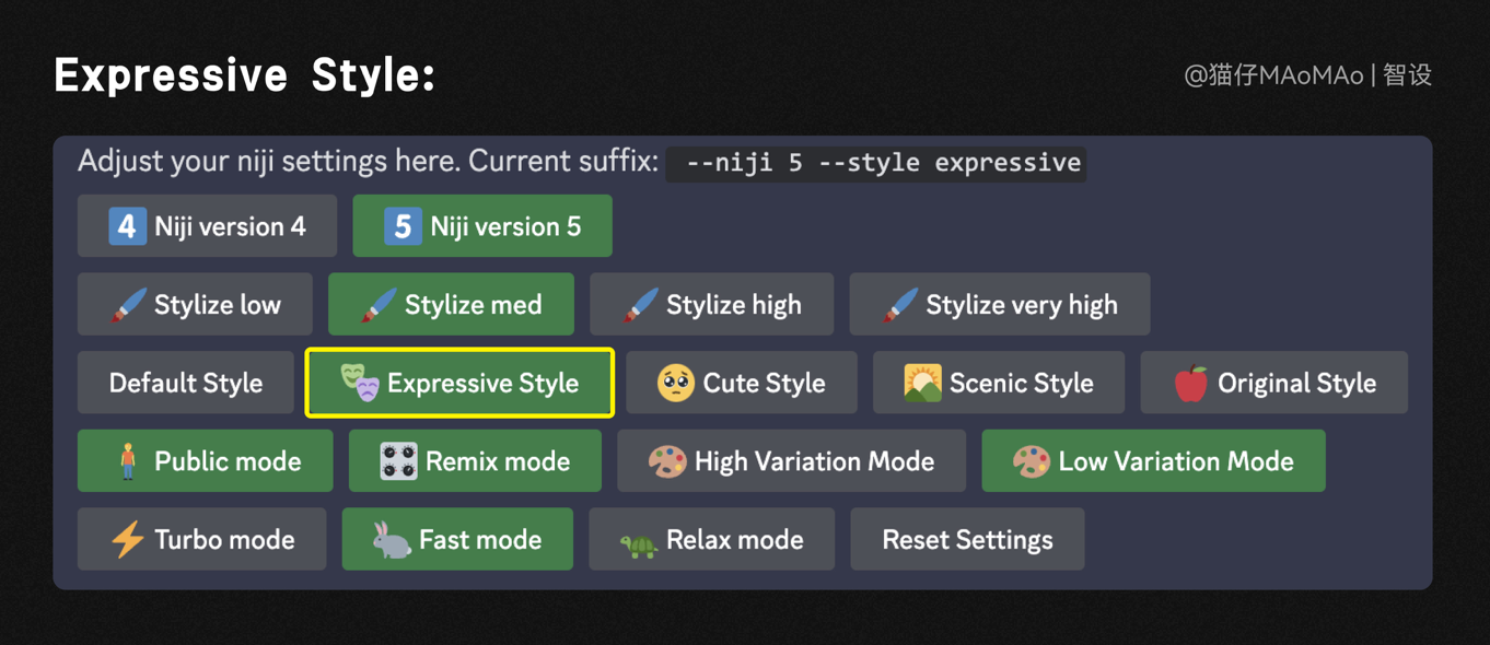 因?yàn)槭菃蝹€元素生成,背景環(huán)境關(guān)鍵詞可以省略,大家在編寫關(guān)鍵詞時,注意靈活增減,不用一定按照所謂的公式來寫,藝術(shù)風(fēng)格是插畫素材,我們直接使用niji模型,其中expressive風(fēng)格會讓插畫更加富有表現(xiàn)力,可以直接在關(guān)鍵詞后面加上后綴“--style expressive ”,或者用“/settings”命令,更改設(shè)置。