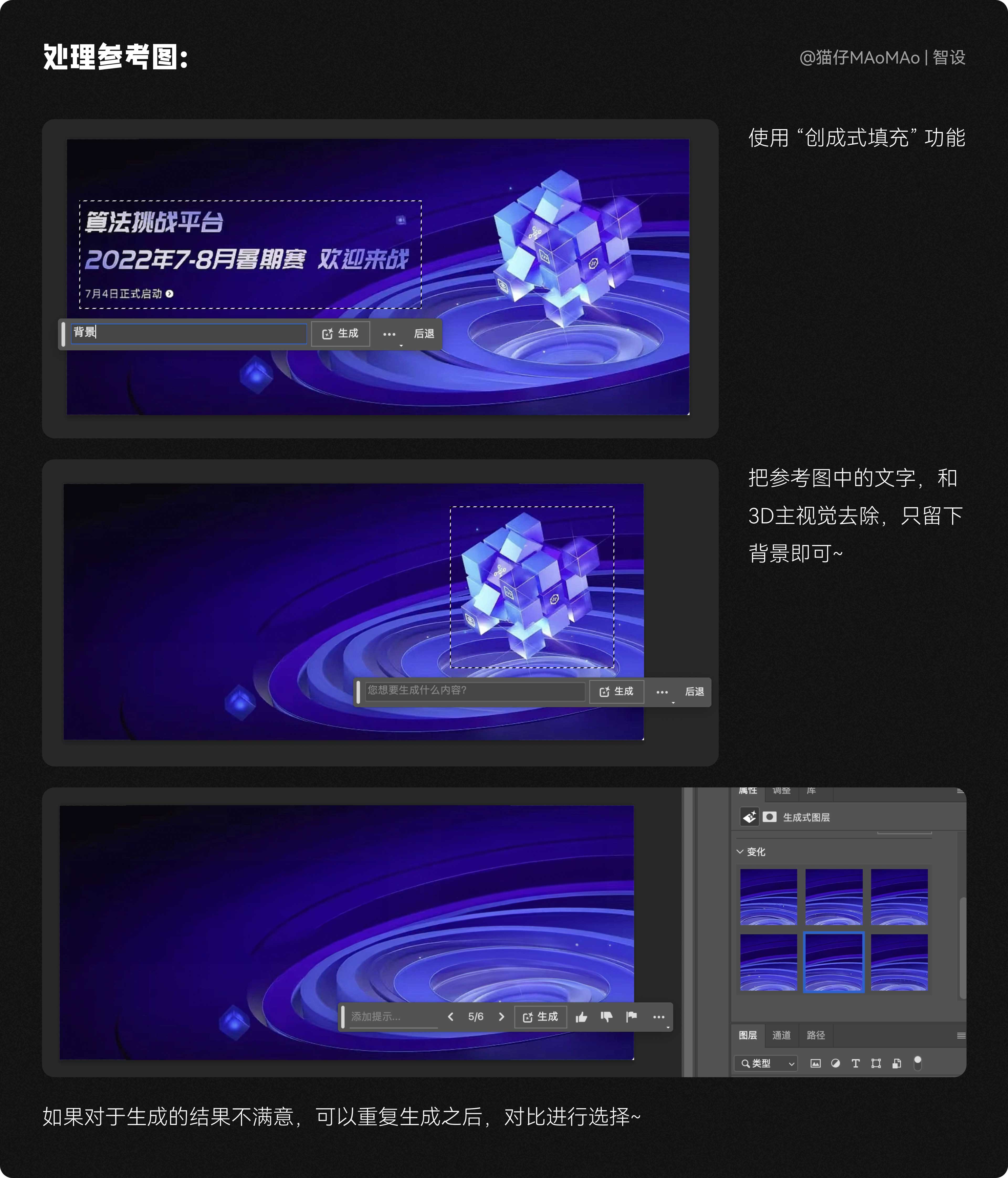 盡管AI現(xiàn)在可以輔助我們進(jìn)行設(shè)計,但設(shè)計師的審美和基本功仍然至關(guān)重要,在輸出核心素材時,我們需要通過不斷微調(diào)細(xì)節(jié),從大量素材中精挑細(xì)選出最合適的那一個,最終得到我們需要的背景素材圖。