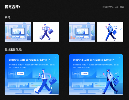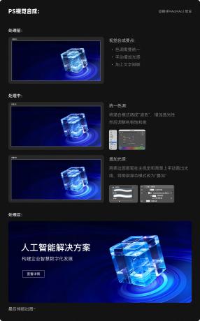 這一步考驗(yàn)的是設(shè)計師的審美和手活,我們需要把背景和主視覺素材,進(jìn)行視覺合成,其實(shí)也非常簡單:這里我定的主要色調(diào)是藍(lán)色+青色的光感,首先需要將色調(diào)整體統(tǒng)一;然后想要表現(xiàn)出玻璃質(zhì)感的通透,我們需要加上一些光感;最后文字排版出圖即可~