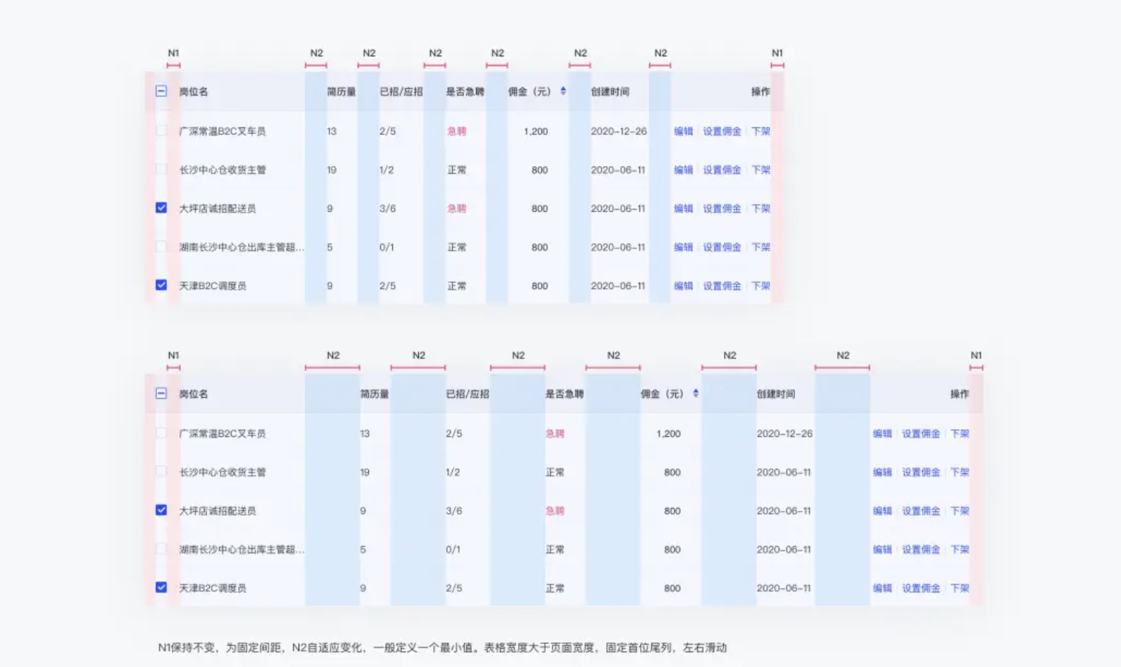 合適的填充和邊距對于視覺設(shè)計至關(guān)重要,以保證易讀性。定義列的間距時,我通常的做法是N1保持不變,將N2定義一個最小值,N2再根據(jù)表格的寬度自適應(yīng)變化。表格主要適配到這個最小寬度,這一步驟通常的設(shè)計系統(tǒng)的初期就要完成,一方面可根據(jù)自己項目目前情況,按照導(dǎo)航寬度等固定尺寸確定最小的表格寬度,這樣在處理最小尺寸時,可以有一個明確的邊界,同時能與開發(fā)同學(xué)進行理解溝通。當表格寬度大于頁面寬度,固定首尾列,左右滑動。