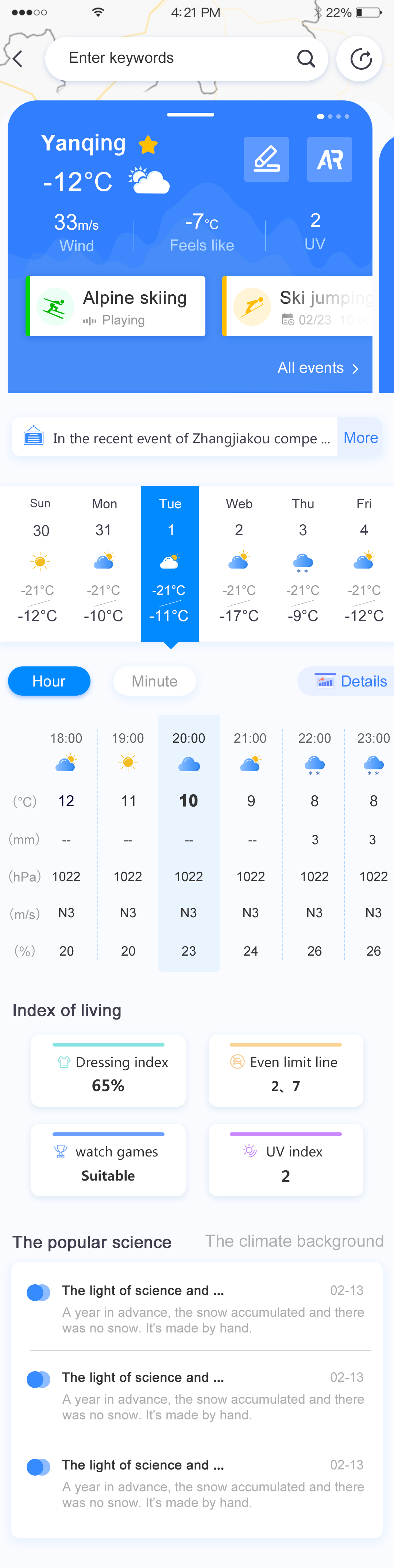 實況模塊,當用戶在京津冀地區(qū)時,進入主頁便會顯示當前位置的的實況信息,當用戶不在時便會顯示為“北京賽區(qū)”的實況信息。點擊地點名稱旁邊的小箭頭,可以切換到其它賽區(qū)或者站點的實況天氣。實時信息往上滑動便可以查看更多的氣象要素信息,如下圖。