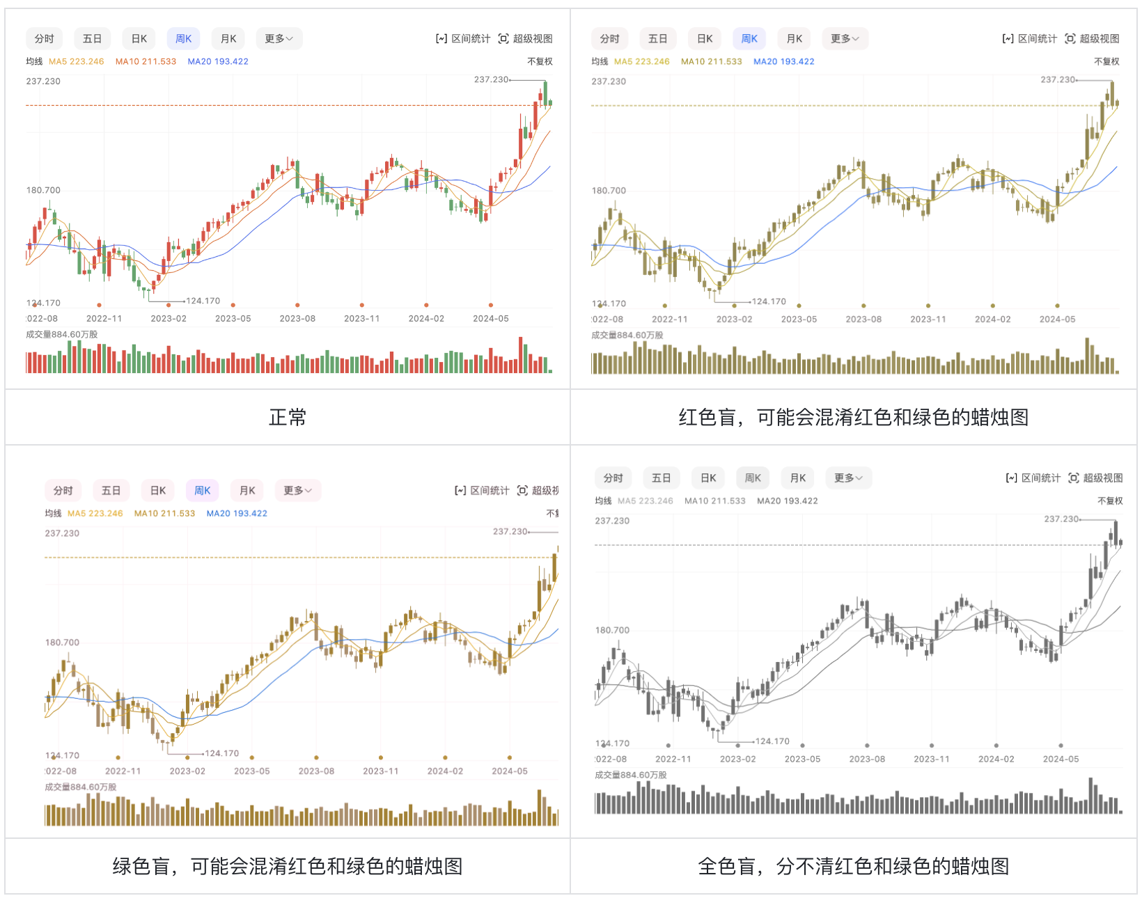 在股票市場(chǎng)中,顏色編碼是信息傳達(dá)的重要手段。許多分析工具使用紅色和綠色來表示虧損和盈利,這種直觀的視覺信號(hào)對(duì)大多數(shù)投資者十分有效。然而,色盲投資者在分析市場(chǎng)動(dòng)態(tài)時(shí),往往因無(wú)法準(zhǔn)確分辨這些顏色而產(chǎn)生誤解,影響他們的決策能力。例如,紅綠色盲的投資者在分析股票個(gè)股時(shí),可能會(huì)混淆紅色和綠色的蠟燭圖,導(dǎo)致錯(cuò)誤的投資判斷。