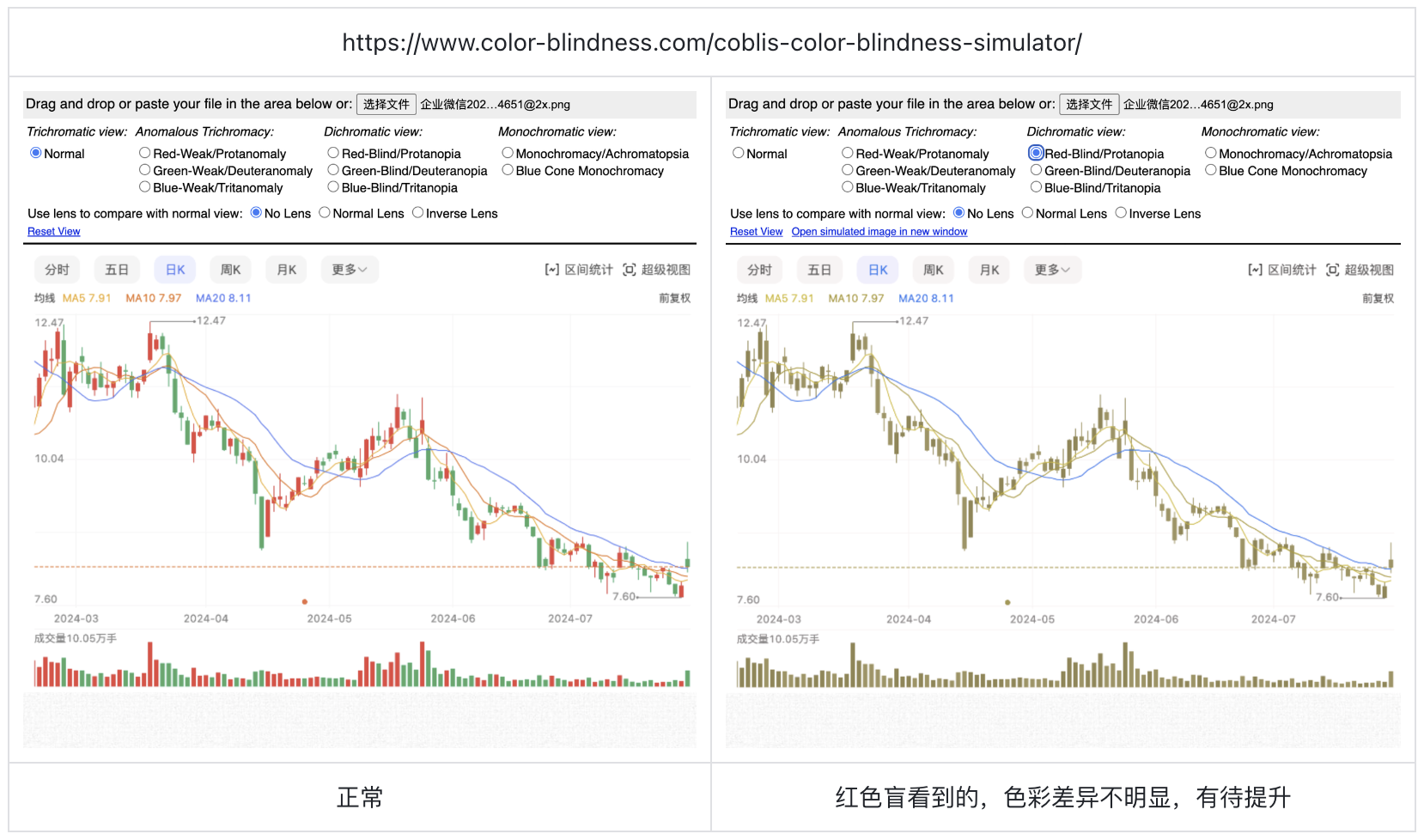 全色盲投資者更是由于只能感知明暗,在遇到這類過度依賴顏色且缺乏其他輔助元素的圖表時(shí),幾乎無(wú)法從中獲取有效的信息,難以全面理解市場(chǎng)分析的要點(diǎn)和趨勢(shì)。