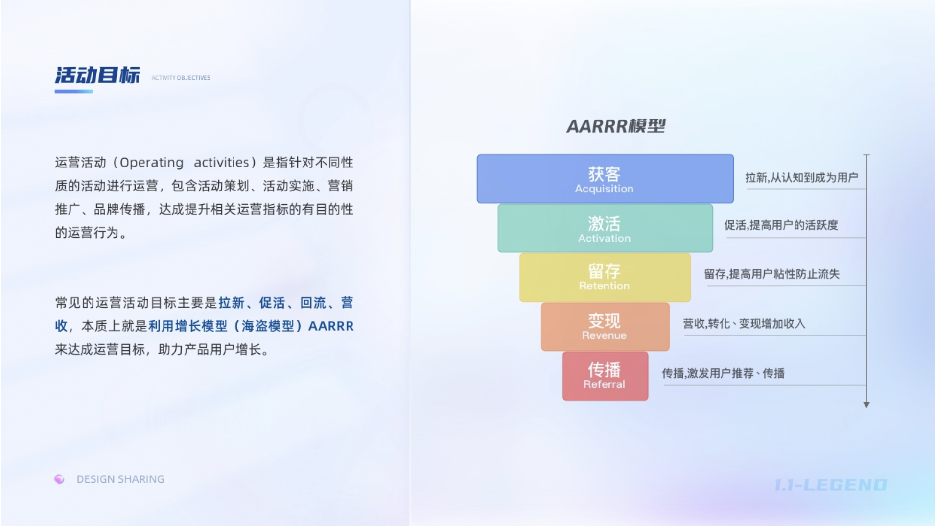 運(yùn)營(yíng)活動(dòng)(Operating activities)是指針對(duì)不同性質(zhì)的活動(dòng)進(jìn)行運(yùn)營(yíng),包含活動(dòng)策劃、活動(dòng)實(shí)施、營(yíng)銷推廣、品牌傳播,達(dá)成提升相關(guān)運(yùn)營(yíng)指標(biāo)的有目的的運(yùn)營(yíng)行為。為了更好的達(dá)成既定目標(biāo),項(xiàng)目立項(xiàng)后我們需要了解此次運(yùn)營(yíng)活動(dòng)的目標(biāo),以目標(biāo)展開設(shè)計(jì)策略和設(shè)計(jì)實(shí)施。常見(jiàn)的運(yùn)營(yíng)活動(dòng)目標(biāo)主要是拉新、促活、回流、營(yíng)收,本質(zhì)上就是利用增長(zhǎng)模型AARRR來(lái)達(dá)成運(yùn)營(yíng)目標(biāo),助力產(chǎn)品用戶增長(zhǎng)。