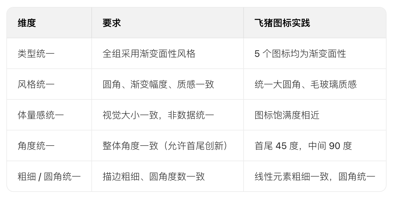 “三維圖標(biāo)設(shè)計(jì)寶典” 方法論,強(qiáng)調(diào)從前期構(gòu)思(分析競(jìng)品如馬蜂窩與本品飛豬的圖標(biāo)類型、配色、風(fēng)格及核心辨識(shí)點(diǎn),通過關(guān)鍵詞腦暴鎖定 “品質(zhì)、活力、青春” 方向并產(chǎn)出情緒版)、繪制圖標(biāo)(具象功能、簡(jiǎn)化結(jié)構(gòu)、確定基本形,融入飛豬品牌超級(jí)符號(hào),添加毛玻璃質(zhì)感等細(xì)節(jié))到走查圖標(biāo)(從辨識(shí)度、統(tǒng)一性、美感度、差異化四方面檢查,如類型、風(fēng)格、體量感統(tǒng)一,融入品牌符號(hào)增強(qiáng)差異化)的完整流程,助設(shè)計(jì)師提升過稿率。