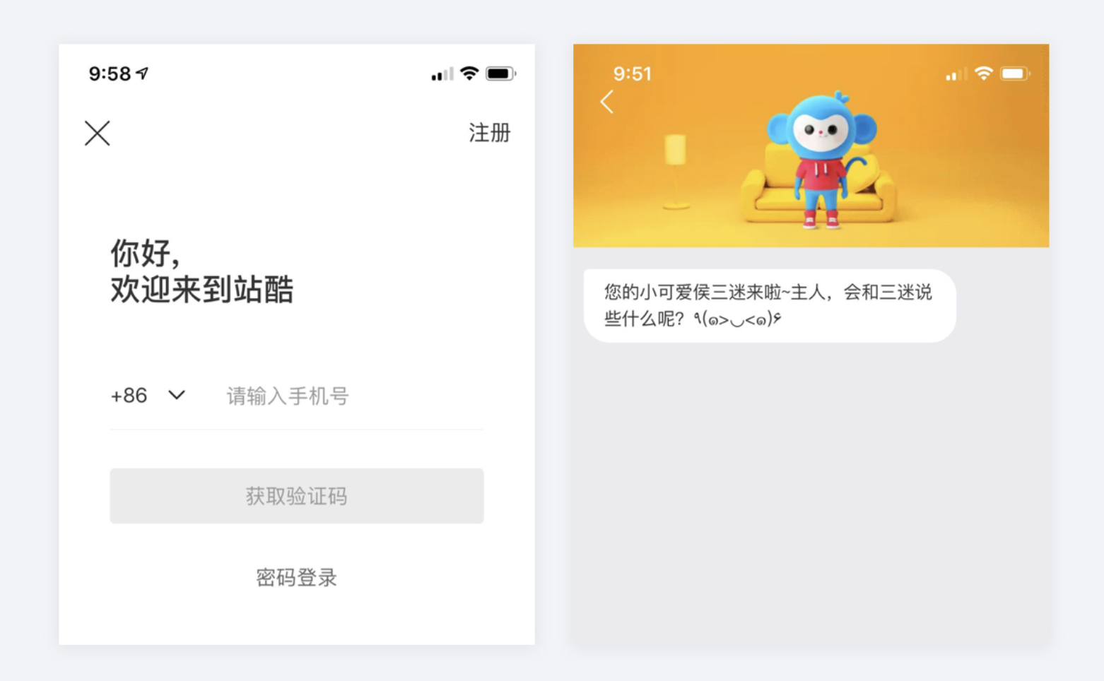 - 有趣的擬人化動作設計:產品作出擬人化互動反饋,讓用戶感到有趣,如嗶哩嗶哩 APP 登錄輸入密碼時,IP 形象 22 和 33 會把眼睛捂起來,給用戶安全感且有趣。