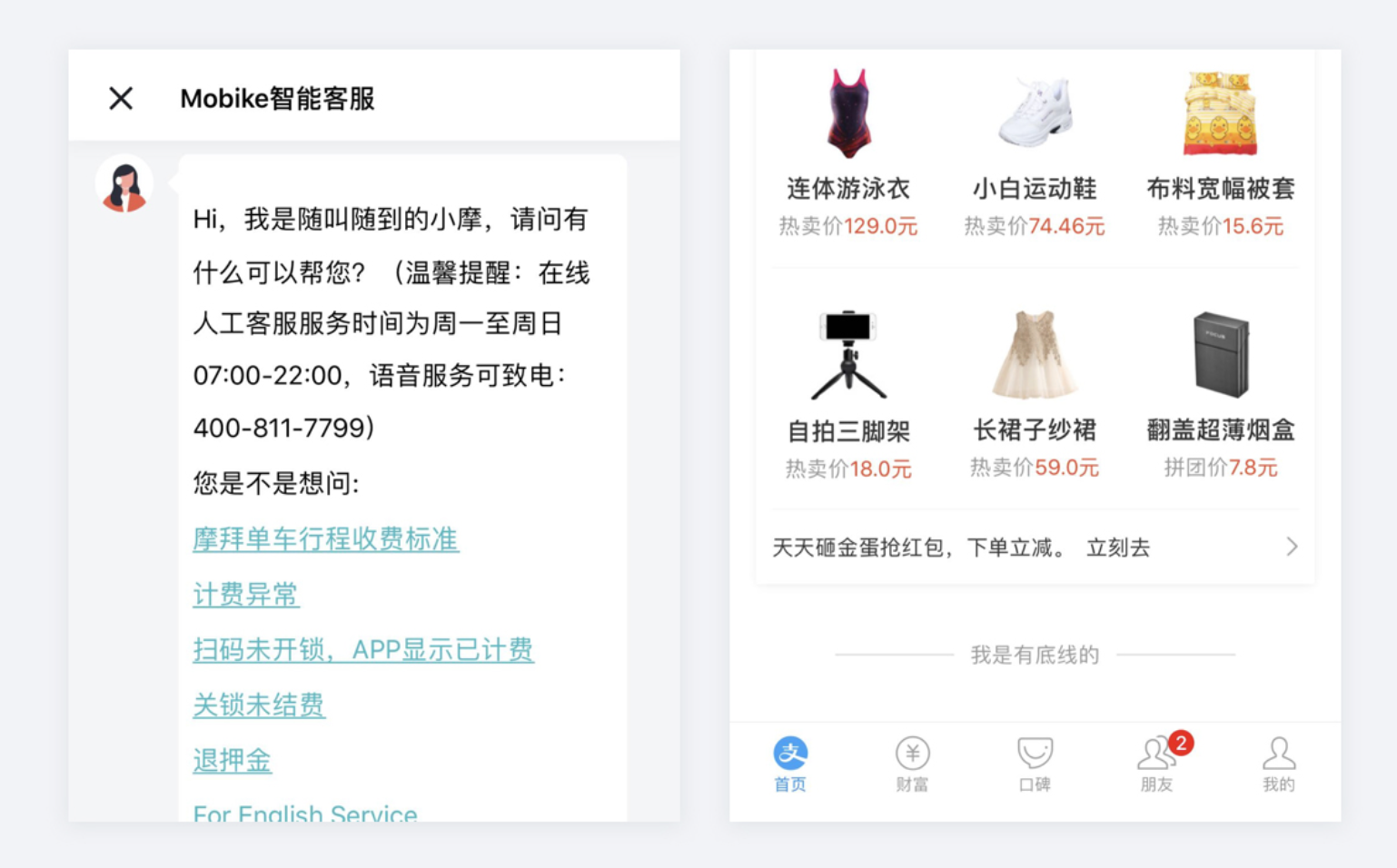 - 明確服務者定位的設計:站在服務者角度,以親近方式與用戶溝通,讓用戶感受產品溫度,如摩拜單車 APP 在線客服用 “您” 稱呼用戶,支付寶 APP 用 “我是有底線的” 幽默文案拉近關系。