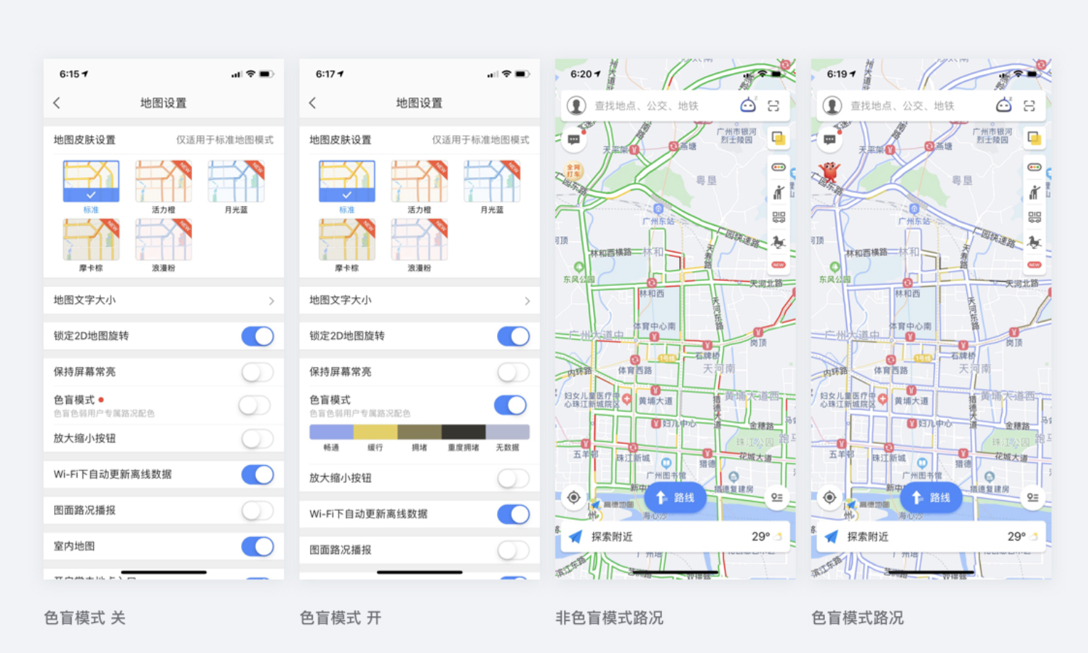 - 無障礙化的設計:重視服務特殊人群的設計,體現(xiàn)人文關懷和產品合理性、智能性,如高德地圖 APP 為色盲人群提供專屬路況信息顏色開關并可隨意編輯顏色。