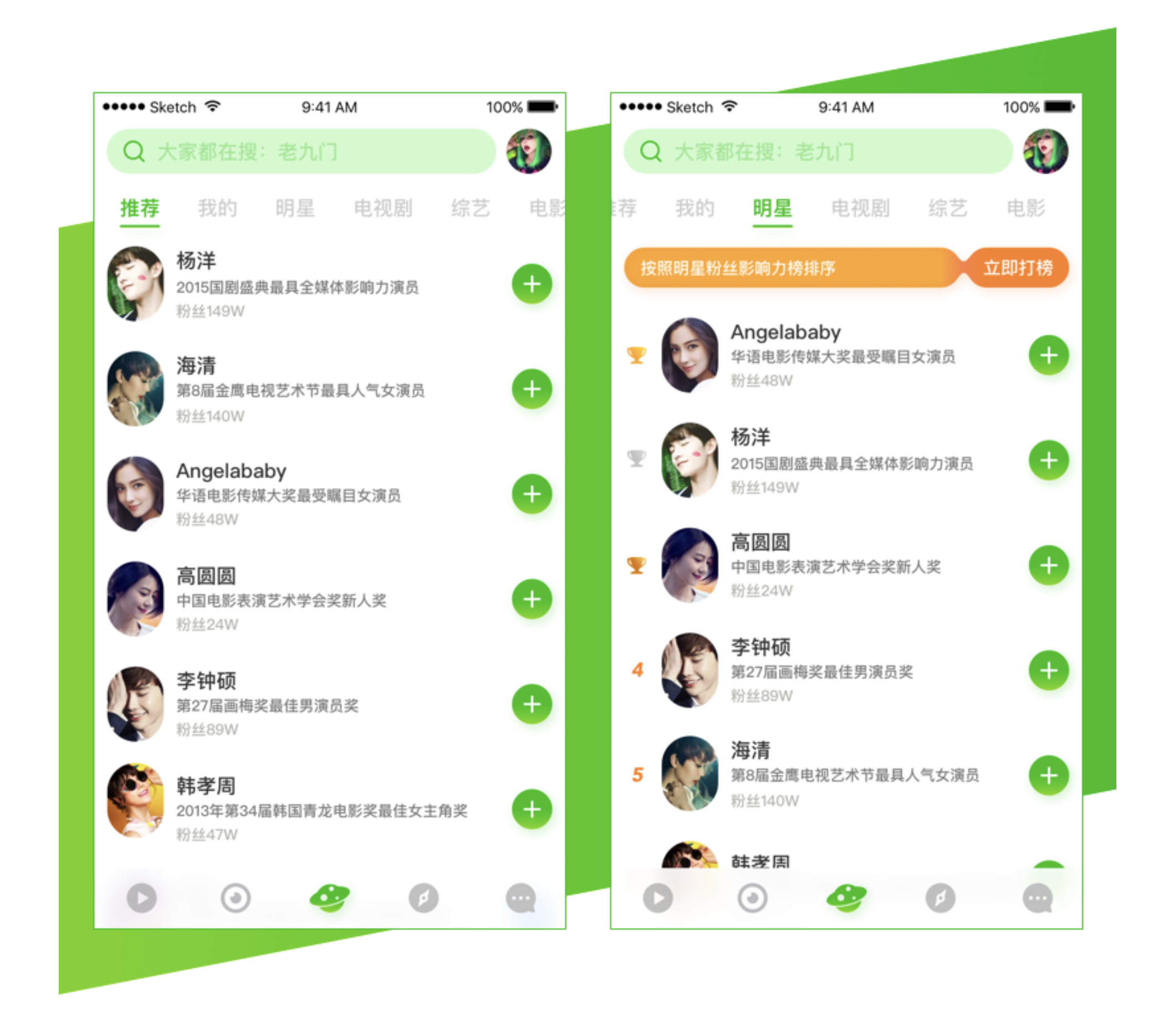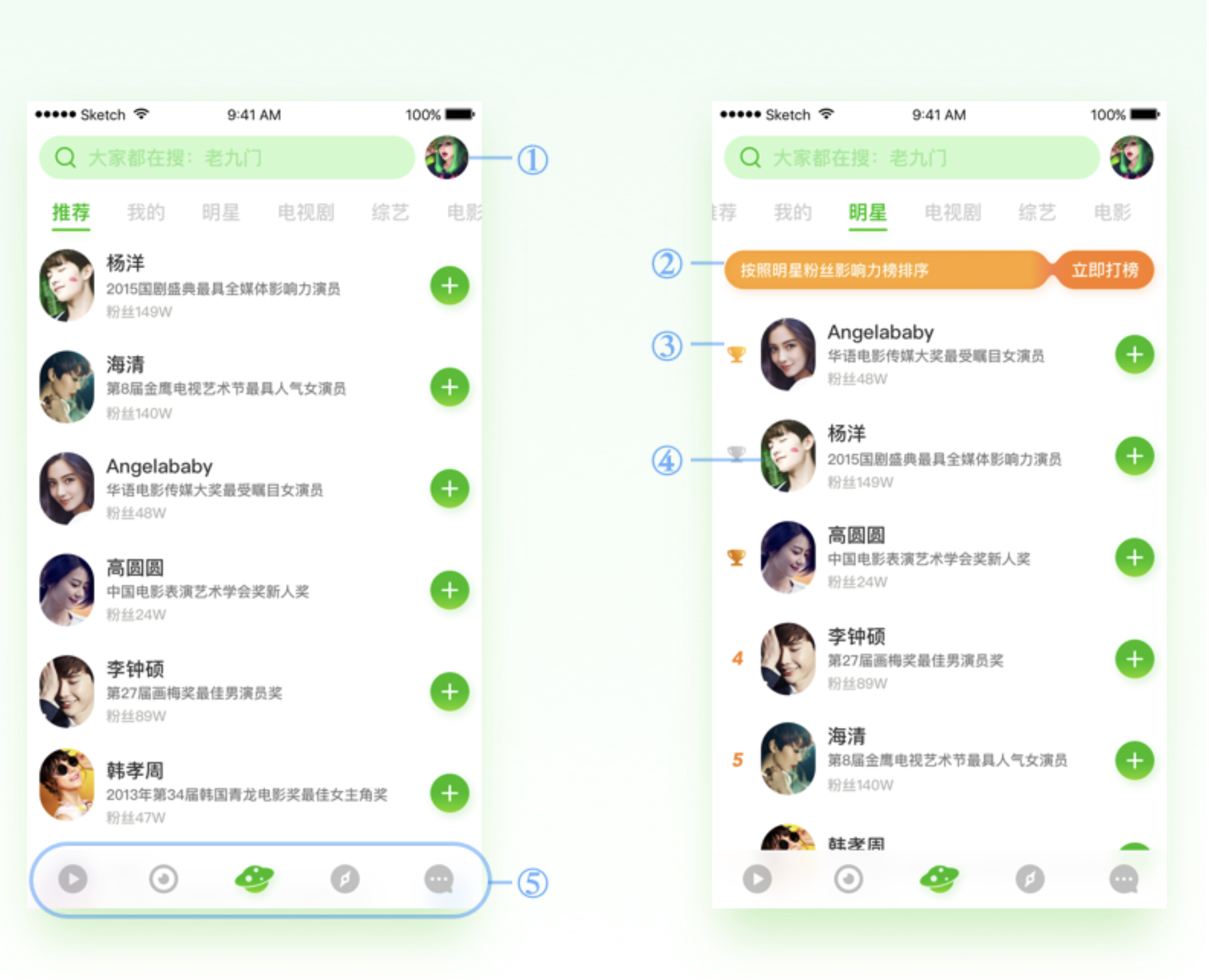 - 信息展示:明星圈簡介字段保留,布局與推薦頁一致;明星標簽頁將排序信息放列表左側(cè),不外露影響力分值等與排名相關信息,營造榜單氛圍。