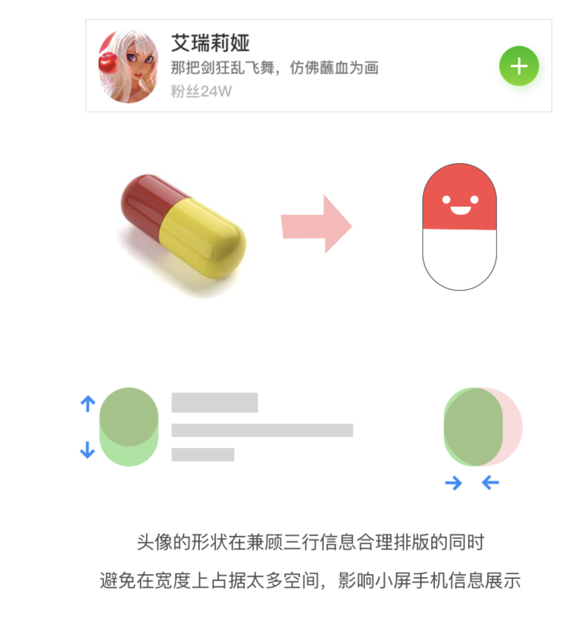 - 頭像形狀:首創(chuàng)膠囊形頭像,兼顧三行信息排版,避免小屏手機寬度占用過多空間。