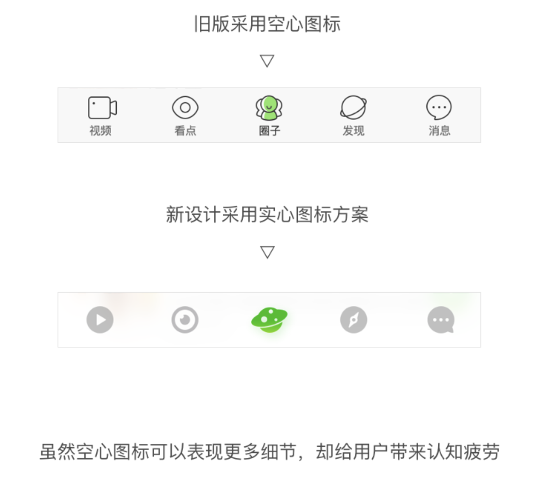 - 圖標選擇:采用實心圖標,依據(jù)國外設計師 Aubrey Johnson 的 25000 個圖標識別實驗,實心圖標更符合大眾審美且識別速度更快,如手機 QQ 和 Apple Music 也改用實心圖標。