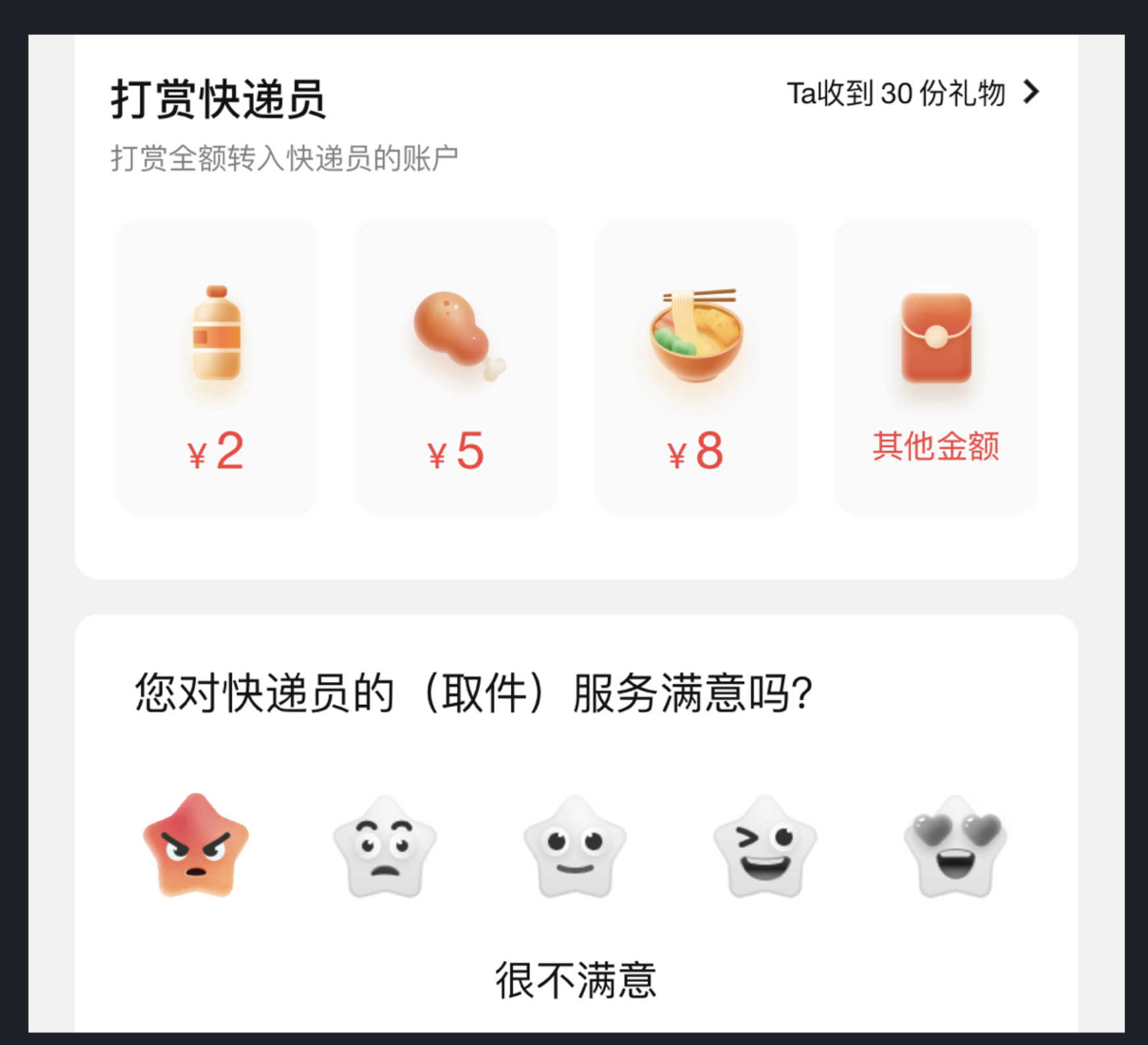 順豐速運(yùn)在用戶(hù)完成快遞服務(wù)后,通過(guò)打賞功能和滿(mǎn)意度評(píng)價(jià)環(huán)節(jié),用直觀的表情圖標(biāo)體現(xiàn)不同滿(mǎn)意度等級(jí)(很不滿(mǎn)意、不滿(mǎn)意、一般、滿(mǎn)意、非常滿(mǎn)意),并搭配具體評(píng)價(jià)選項(xiàng),既形象傳遞信息,又提升了用戶(hù)參與度。