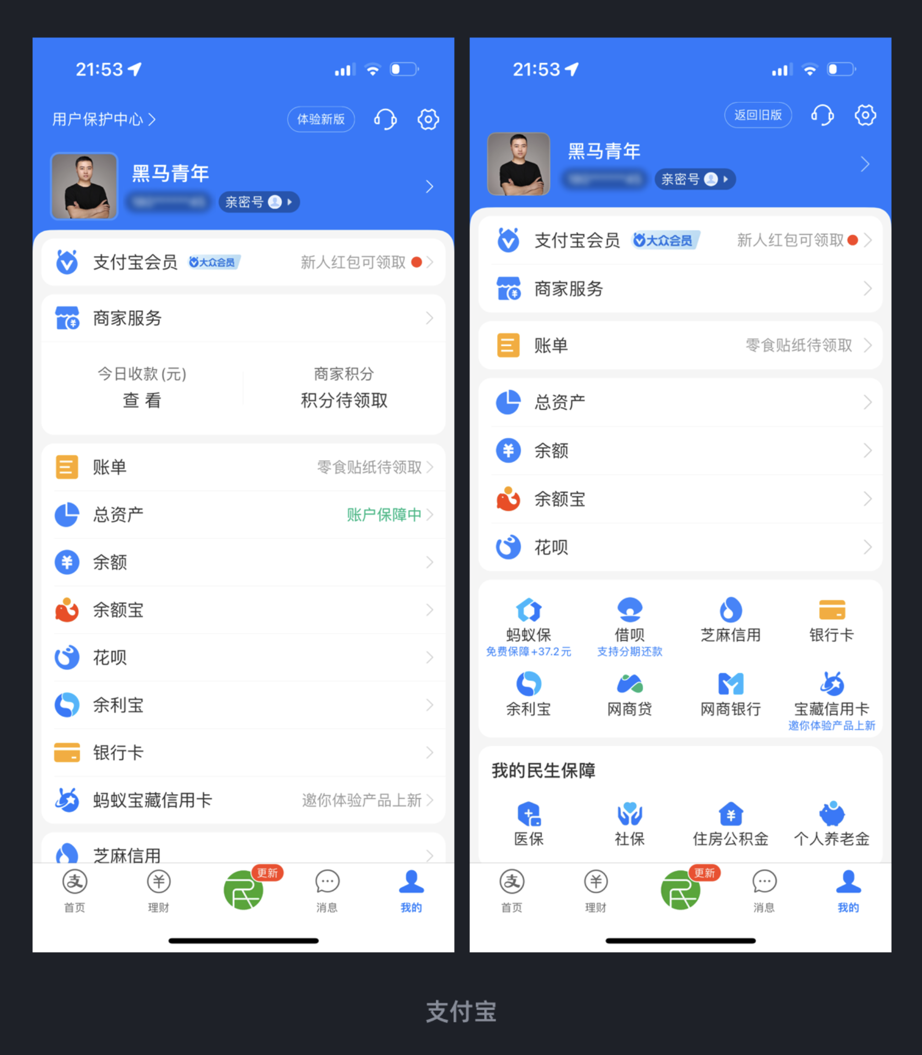 支付寶新版?zhèn)€人中心優(yōu)化布局,將原列表布局改為列表與宮格結(jié)合的形式,使更多功能在首屏曝光,既提高了版面利用率,也讓用戶(hù)操作更快捷。